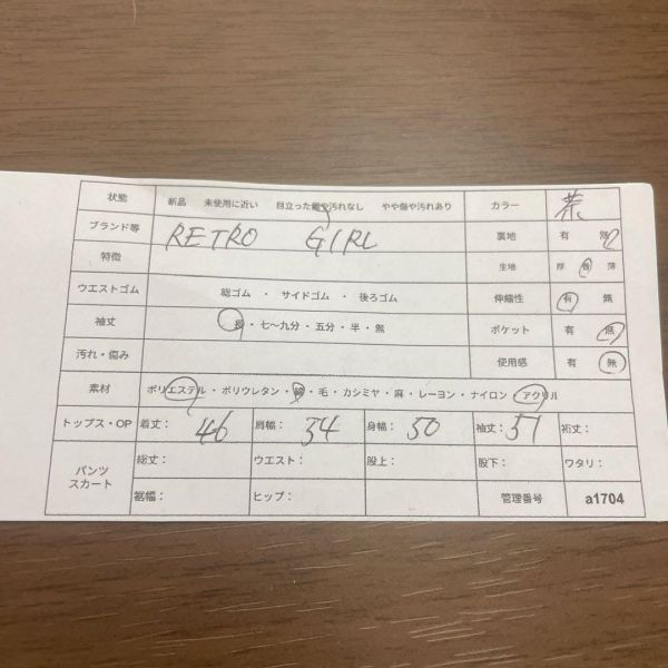 リボンでシルエット自在 RETRO GIRL ケーブルニット ブラウン - ブランド:RETRO GIRL(レトロガール) - アイテム:ケーブルニットプルオーバー - サイズ表記:F(フリーサイズ) - カラー:ブラウン - 素材:アクリル50%/ポリエステル30%/綿20% - 特徴:ウエストリボン付きでシルエット調整が可能なVネックニット。立体的なケーブル編みが女性らしい印象を与えます。柔らかな肌触りで秋冬にぴったり。 管理番号:a1704 即購入大歓迎・お得な割引各種あります 詳しくはプロフィールをご覧ください! 匿名&送料無料 海外輸入のため全て一点ものです 古着のため使用感・毛玉等があることもあります。写真で状態の確認を行なってからご購入ください おまとめ買いでお得な割引あります♪ 平置き採寸表→写真から確認いただけます! (素人採寸のため、多少の誤差はご了承ください) 商品状態に関しては、写真、商品説明欄に記載しております。着用回数、購入時期などはお答えできませんので、ご了承ください。着画、写真の追加もお断りしております。 簡易包装のコンパクト発送となります。 畳みシワはご了承の程、宜しくお願いいたします。 商品によっては圧縮してお送りするものもございます。 撮影環境や使用するモニター、反映されにくい色味など、 商品と画像に若干の色誤差が生じますことをご了承ください。 出品作業の際にしっかりと確認はしておりますが、シミなどの見落としがある場合もございますのでご了承下さい。 古着の取り扱いになりますので特有の匂い等がある可能性があります。ご理解のある方のみご購入の程お願い致します。