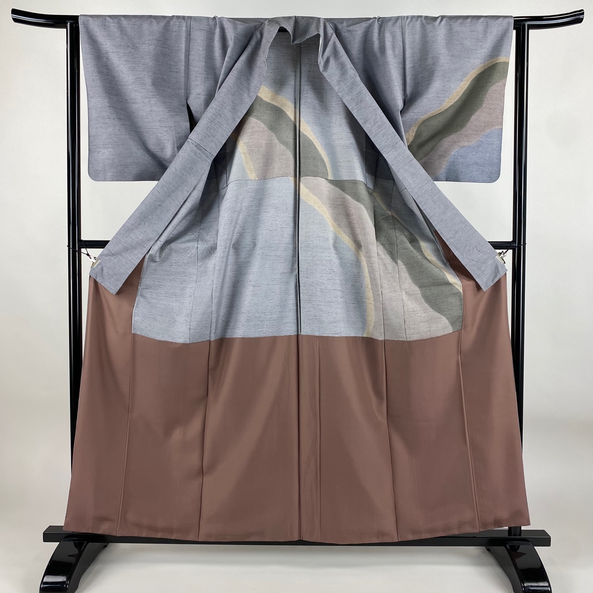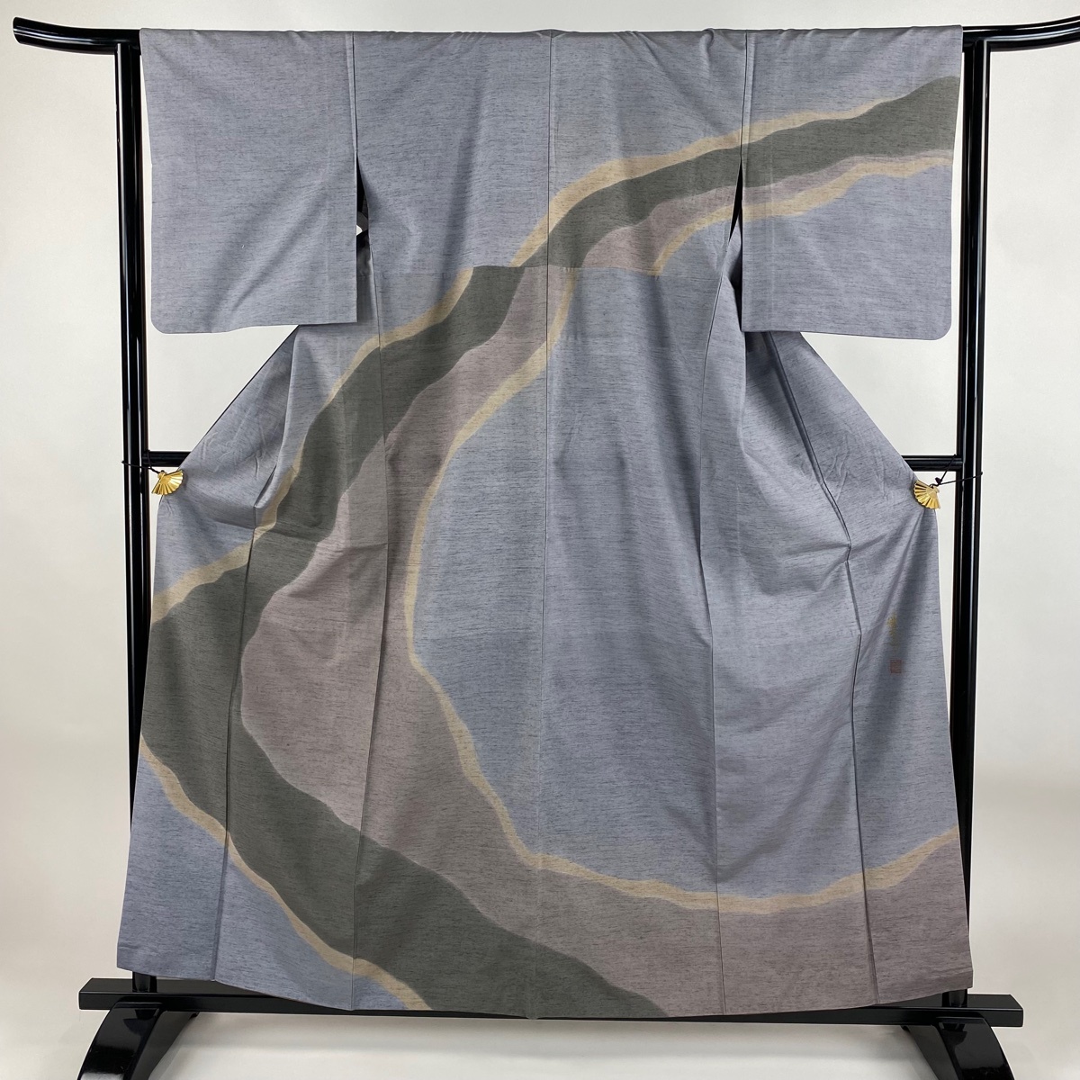 訪問着 身丈160cm 裄丈63cm S 袷 胴抜き 落款 霞 染め分け 青灰色 正絹 秀品 【中古】