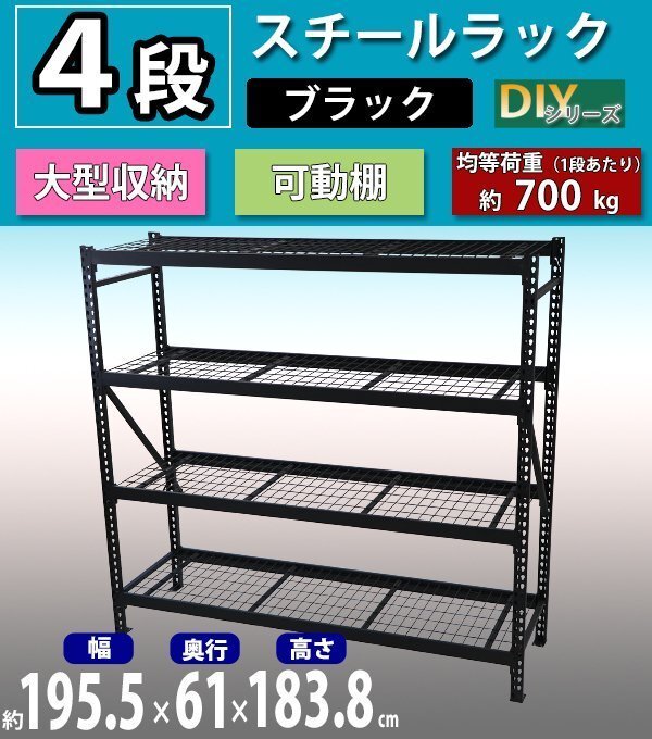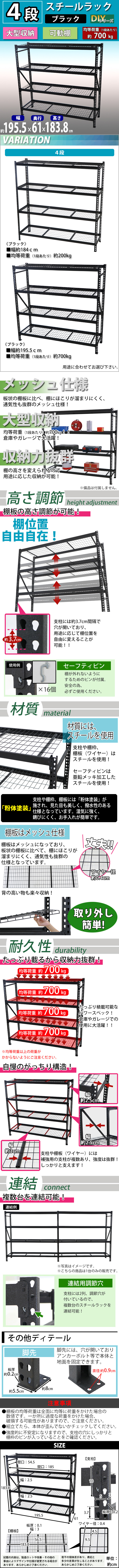| 商品名 | 送料無料 4段 スチールラック 大型 ワイヤーシェルフ ブラック ボルトレス 粉体塗装 約幅195.5×奥行61×高さ183.8cm 高さ調節 スチール棚 スチールシェルフ オープンラック ワイヤー 業務用 収納ラック 収納棚 工具棚 ガレージ 収納 スチール 棚 ラック 黒 4stlrsr42bk |