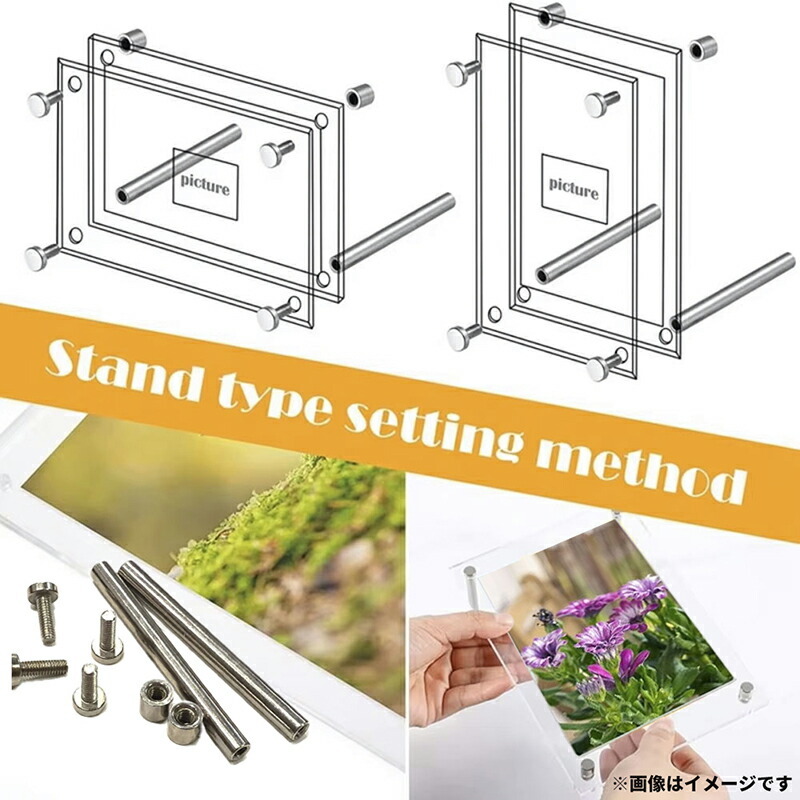 1.フレームの外側の保護フィルムを剥がす、2.二枚アクリル板で写真を挟む、3.付属品ネジで二枚アクリル板を止める。