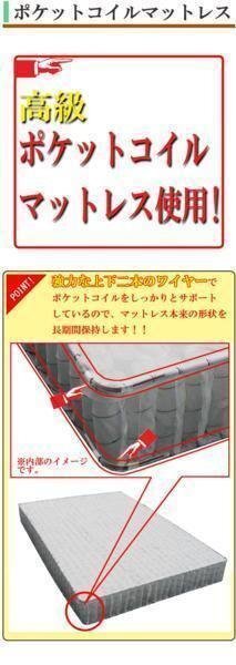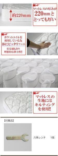 | 商品紹介 | + セミダブルマットレス ○大人気のベッドシリーズ!! 【ベッド】 ●ベッド下に大型の引き出しが2つ設置されています。 ●ヘッドボードには電源コンセントを2個口、側面収納を完備。 ●桐を使用したすのこを採用し、通気性も◎。 ●素材:MDF(ベッド本体) 桐(すのこ) ●塗装:PU塗装 ●電源コンセント(2個口):合計で1500ワットまで使用可。 ●電源コンセント用プラグが1本(長さ約176cm)付属。 ●重量:約74kg 【マットレス】 ●肌触りも良く、調度良い適度な弾力性のマットレスです。 ●刺繍入りでハイグレードな生地を使用した高級ポケットマットレス ●570本のポケットコイルを使っており、体に適度に フィットする機能を持ち、疲れた体を十分にほぐしてくれます。 ●強力な上下二本のワイヤーでポケットコイルをしっかりと サポートしているので、マットレス本来の形状を長期間保持します。 ※こちらの商品は、組立て式です(組立てに必要な工具は付属しています)。 |