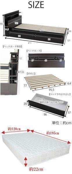 | 商品サイズ | 本体寸法(引き出し付きシステムベッド) : 約(幅)121x約(奥行)211x約(高さ)80.5(cm) 本体寸法(マットレス) : 約120(幅)x約195(奥行き)x約22(高さ)(cm) |