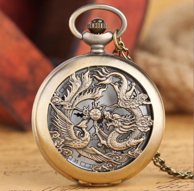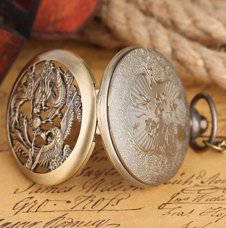 上質 懐中時計 龍と鳳凰 ブロンズ アンティーク チェーン付き 高耐久性 文字盤 メンズ レディース レトロ ヴィンテージ感ペンダント