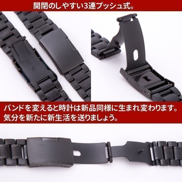 ★送料無料 腕時計 交換ベルト ステンレス 無垢 3連 20mm 弓カン プッシュ式 黒 金属 バンド 予備 カスタム パーツ