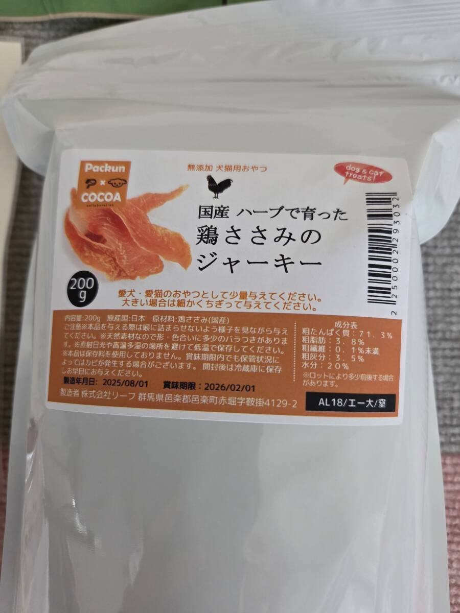 ① 国産 ハーブで育った鶏ささみのジャーキー 200g入り 犬猫用おやつ 無添加 無着色 犬、猫共に食べられます。 PackunxCOCOA 賞味期限 2026年2月1日