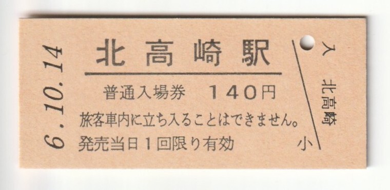 平成6年10月14日 信越本線 北高崎駅 140円硬券普通入場券(日付印刷)