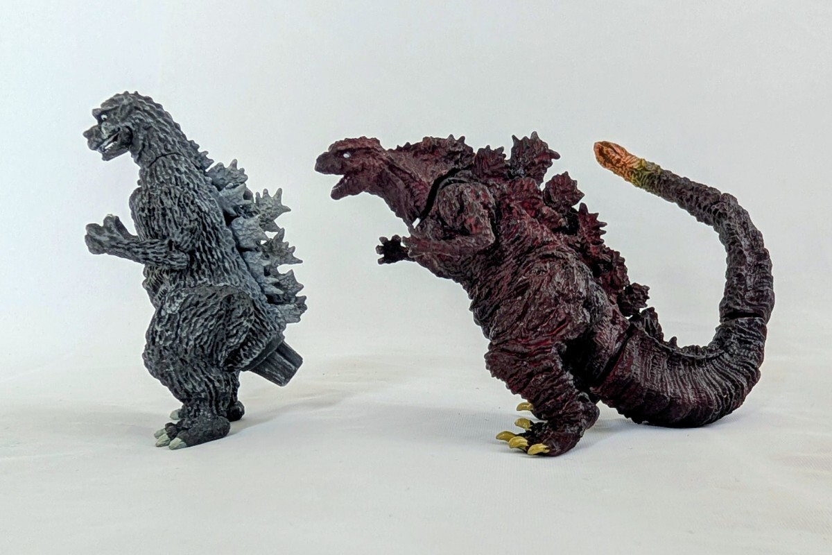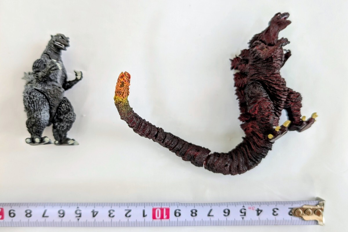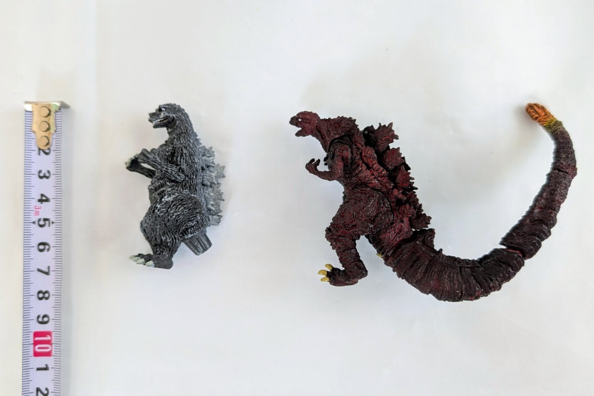 室内でしばらく飾っていましたが特に目立つ破損はございませんが、1954のゴジラのしっぽがなくなってしまいました。その他細かいキズ、若干の色褪せ、若干の塗料剥がれはございます。