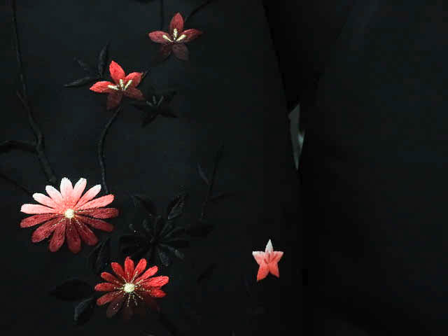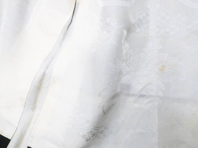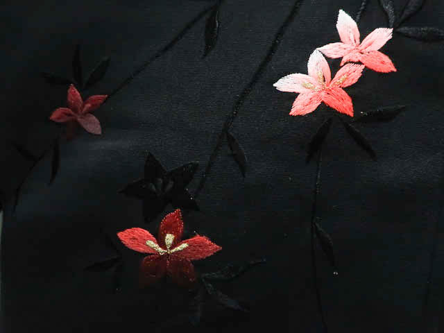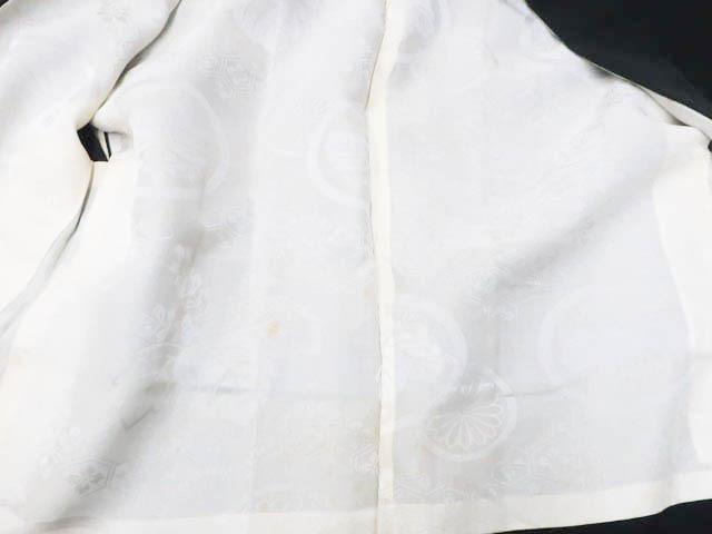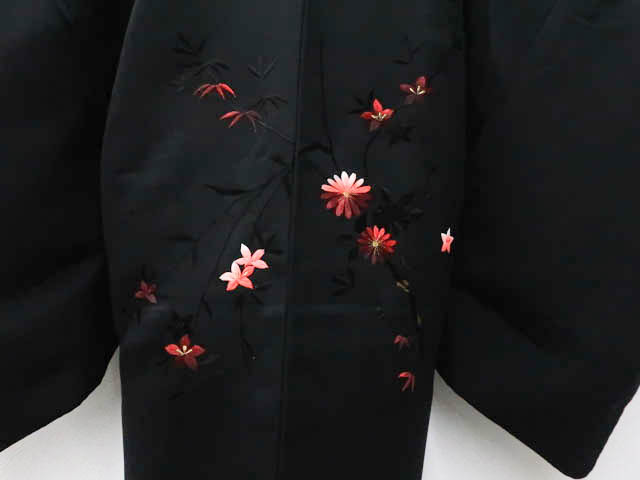 リサイクル商品のため、刺繍に糸飛び出し、袖などその他所々にシミがございますが着用可能なお品です。 地色は、黒色です。 1枚目の画像が近いお色かと思われます。 素材は正絹です。 |