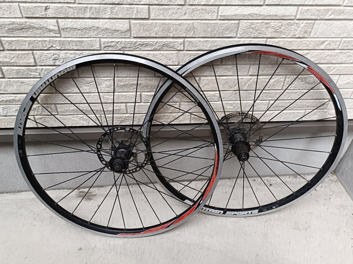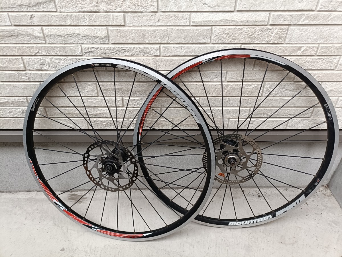 Shimano製のマウンテンバイク用完組ホイール、ディスクブレーキ対応で高い耐久性を誇ります。