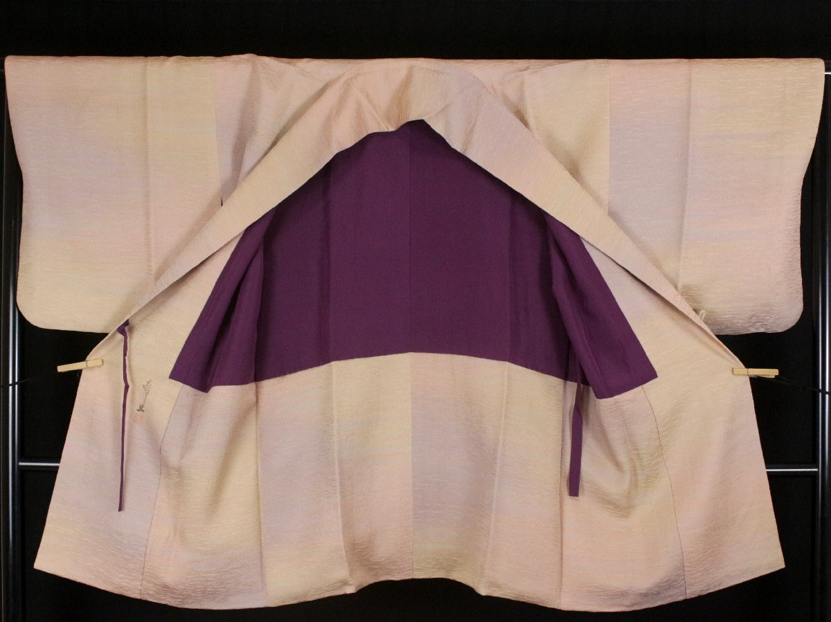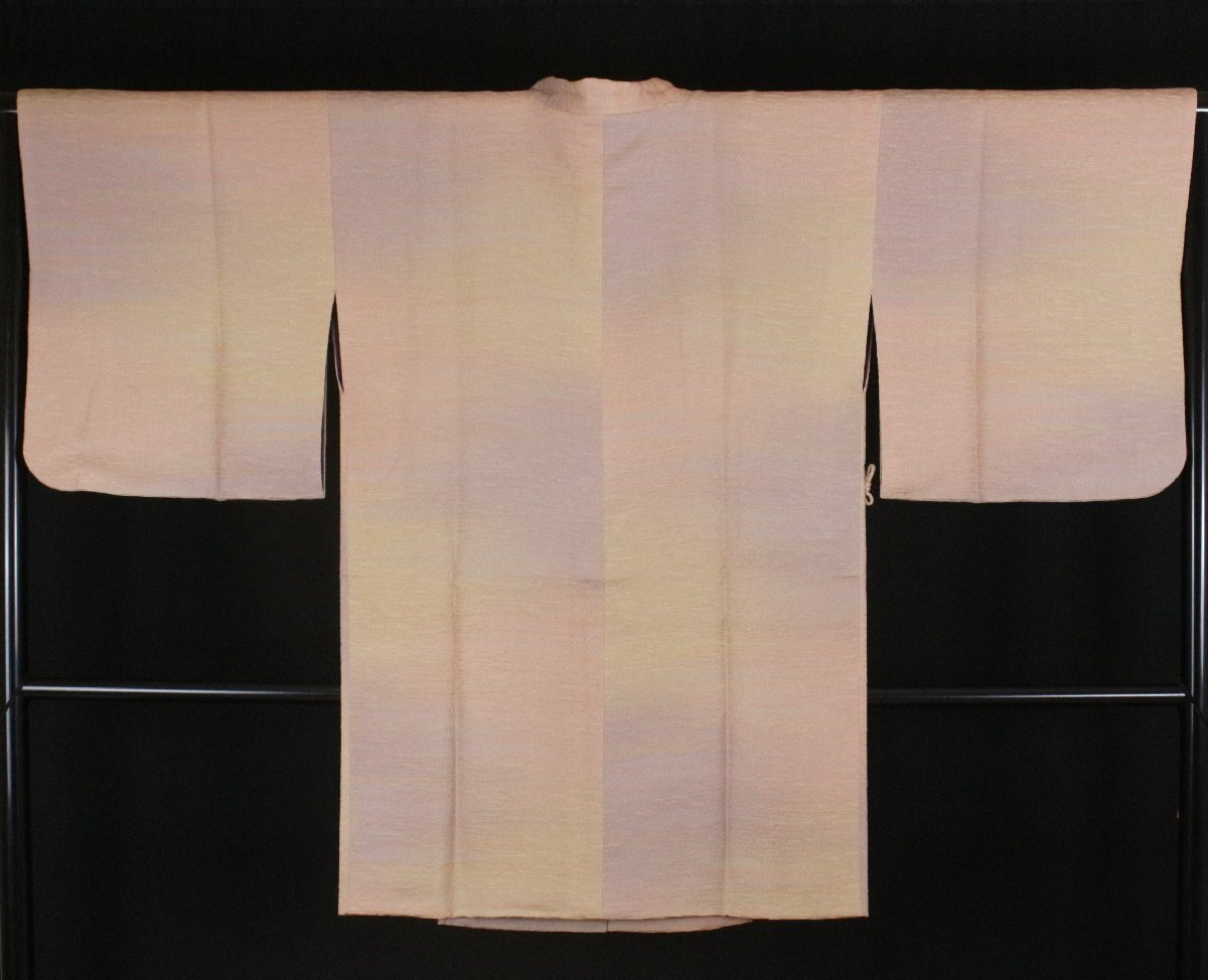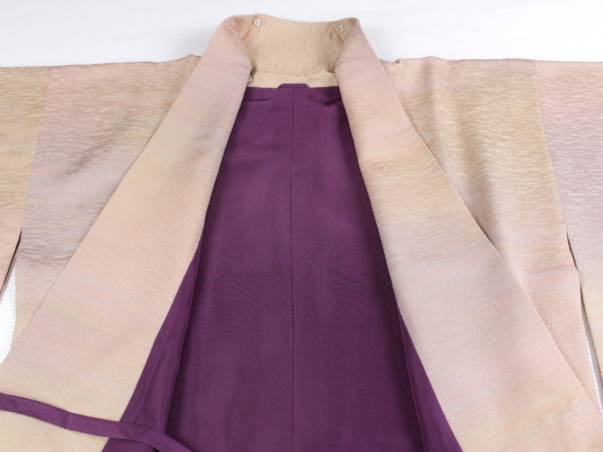 しっとりとした風合いが魅力の正絹道中着のご紹介です。 繊細な地紋が織り出された正絹地に、やわらかな色の濃淡が自然に溶け合う上品な仕上がり。表情豊かな織りの陰影が、穏やかでありながら奥行きのある美しさを演出しています。 羽裏には深みのある色合いが用いられ、羽織を脱いだ際にも上質さが際立つ仕立て。 控えめな色合いと落ち着いた意匠は、装いにさりげない格を添えます。 上品な艶めきをまとった、大人の女性に似合う洗練の一枚です。 【道中着】 着物と同じ衿合わせのコートです。前は備え付けの紐を結んで留めます。 道中着の名前は「道中お気を付けて」という言葉に由来しており、旅路に着るのが一般的だったため、室内では脱ぐのがマナーとされています。 道中着はカジュアルなコートですので、街着やおしゃれ着などのカジュアルなお着物に合わせるのがおすすめでございます。 お目に留まりましたら是非ご検討下さいませ。 ※撮影時の部屋の照明によって画像の色に若干の差がございます。色味に差がございますことをご了承のうえご検討下さいませ。 …状態… 状態良好 ※全くの新品ではございませんので、記載のない変色やスレ、ヤケ、その他僅かな難がある場合がございます。そのような理由でのキャンセルはお受けできませんので、ご了承の上ご検討お願いいたします。 |