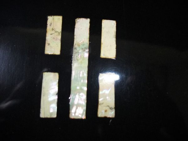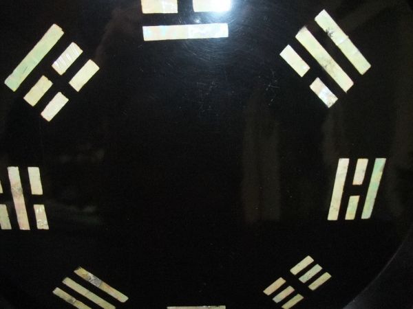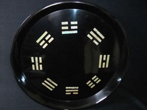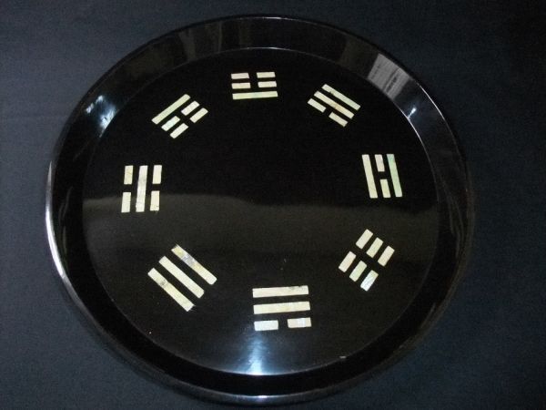 黒塗りの丸盆に青貝の螺鈿 で八卦の象嵌