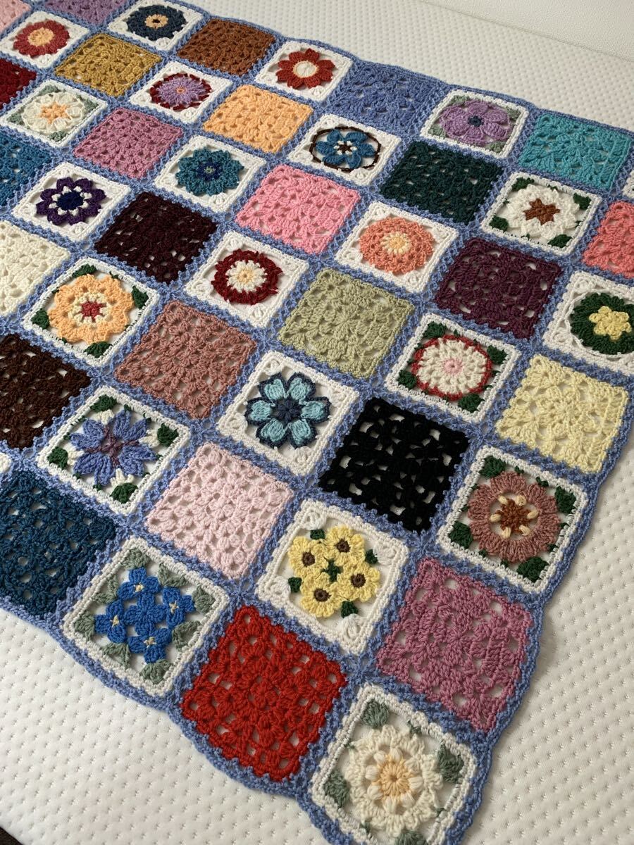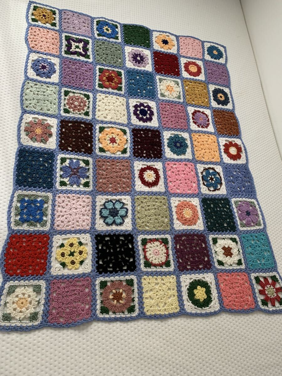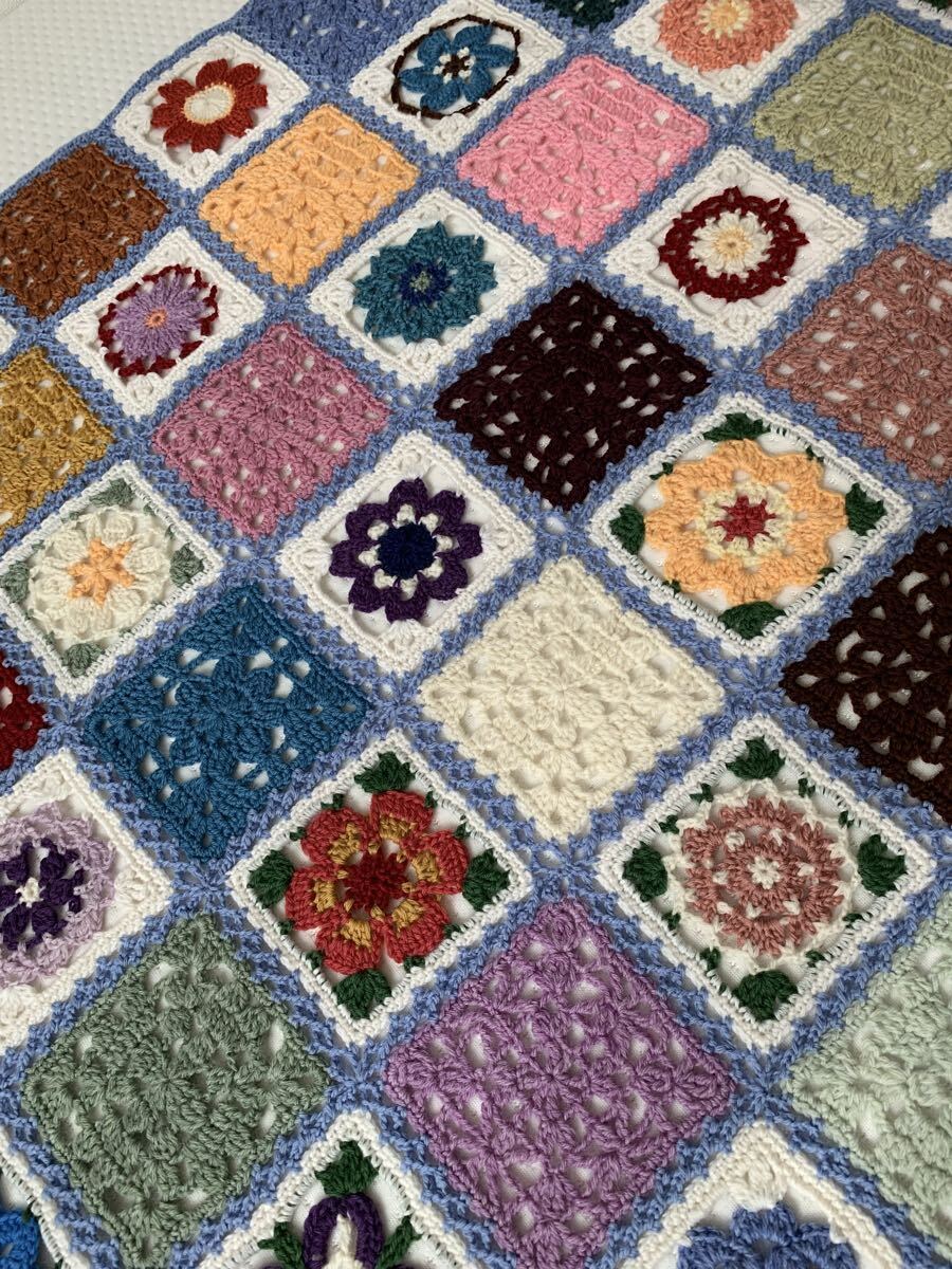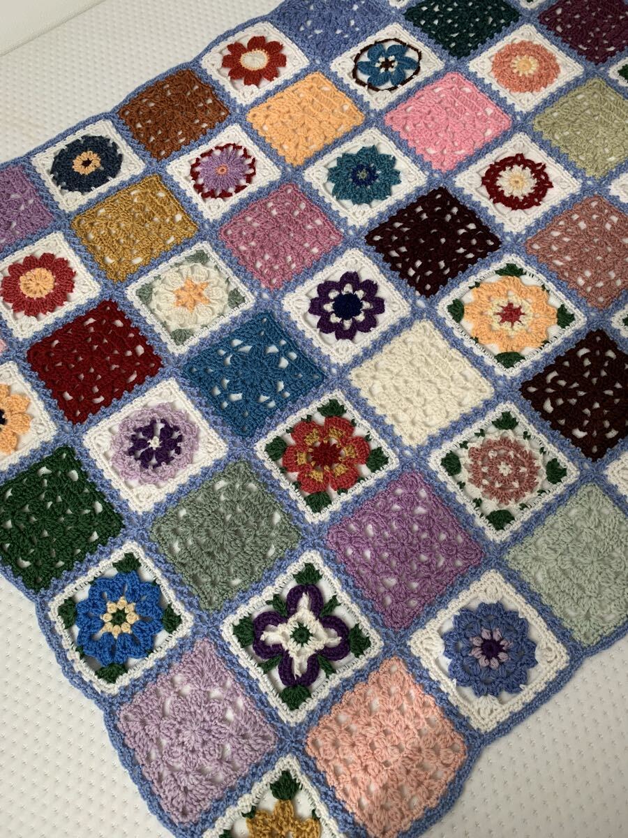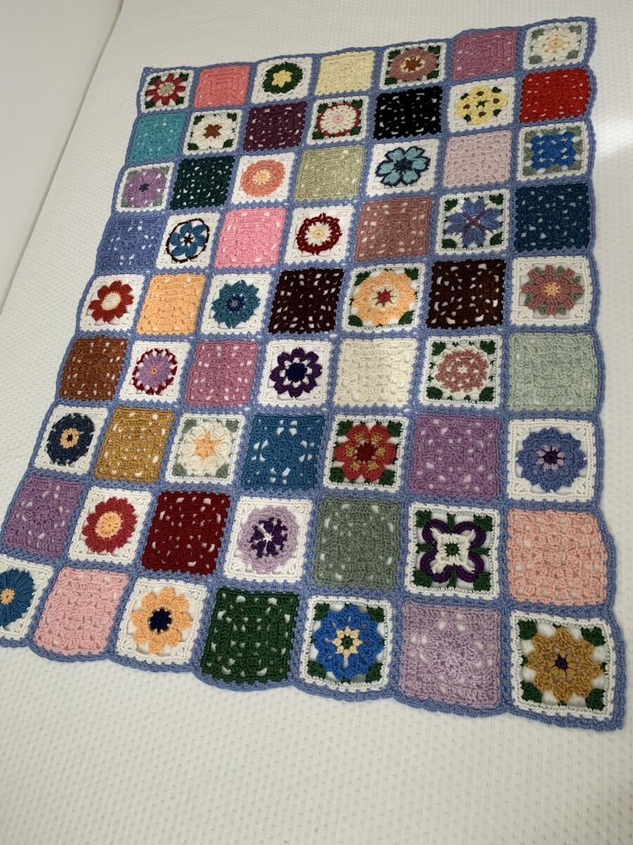 色々な色の毛糸を使って、お花のモチーフをブルー系の糸でつないでみました。