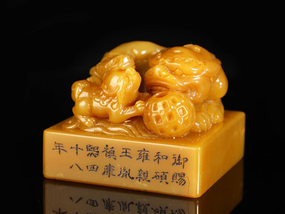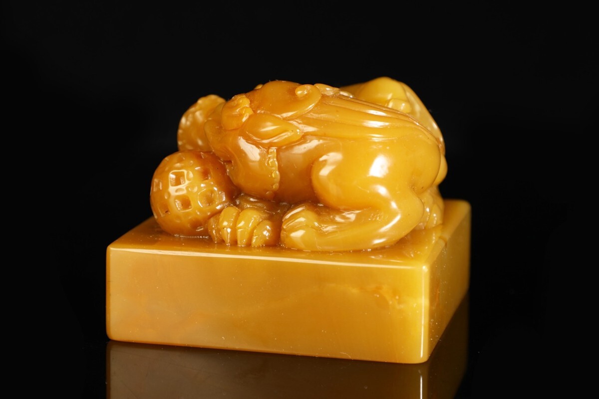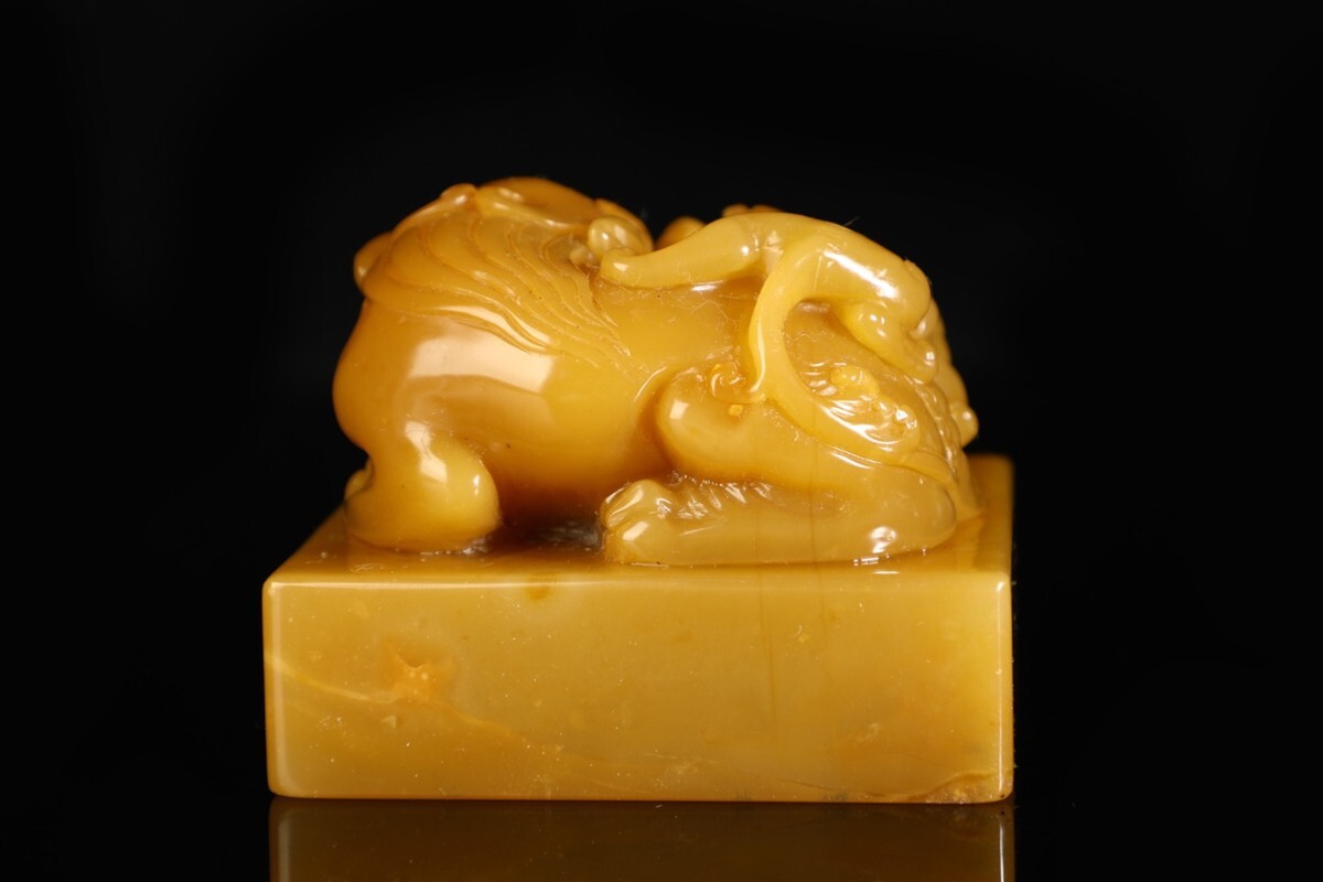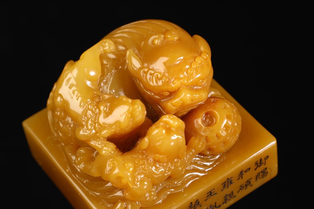 「清 康熙四十八年 老寿山石 田黄石彫り 瑞獅戲球鈕印章」極細工 擺件 古賞物 中国古美術 旧蔵出