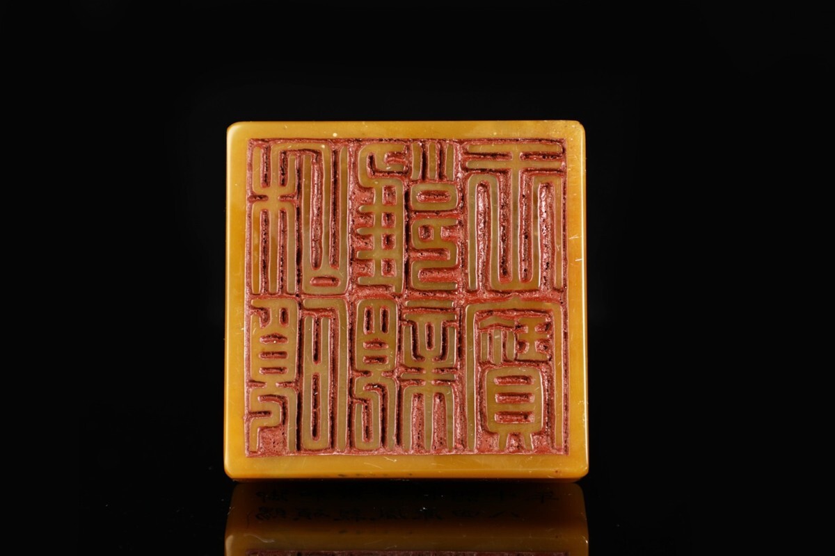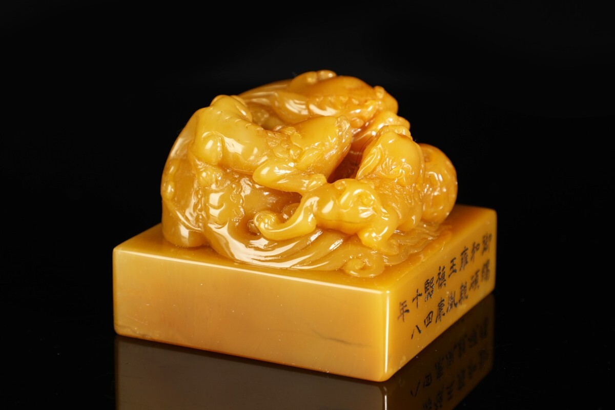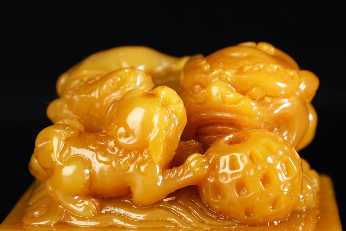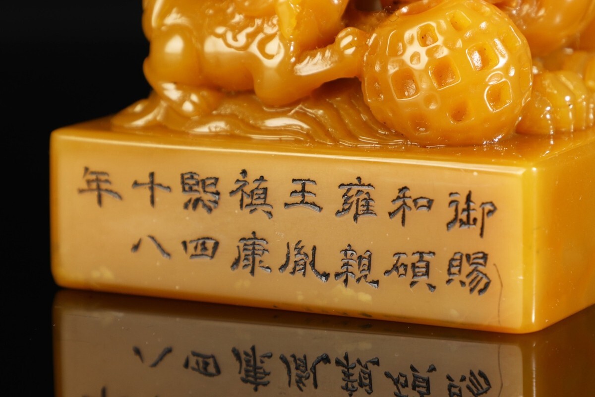 「清 康熙四十八年 老寿山石 田黄石彫り 瑞獅戲球鈕印章」極細工 擺件 古賞物 中国古美術 旧蔵出