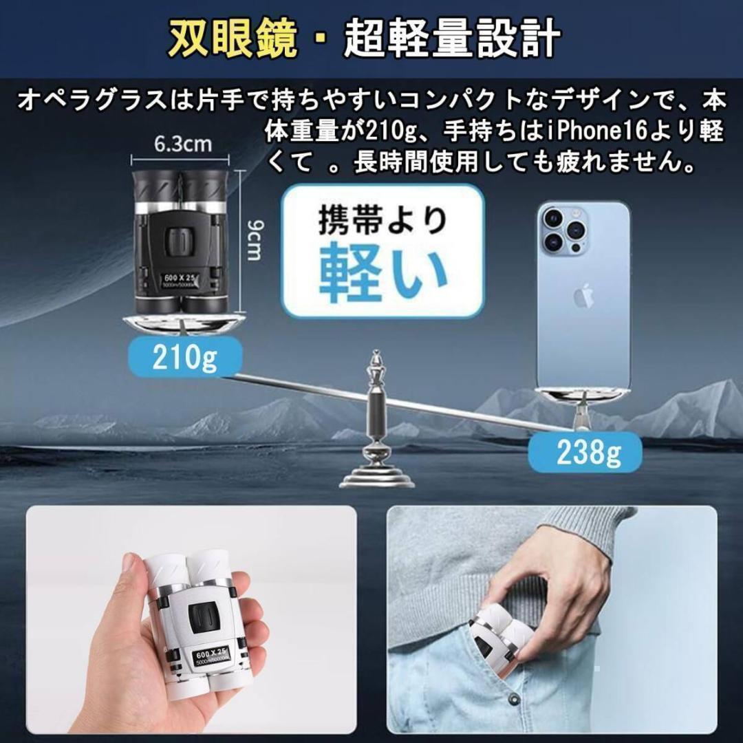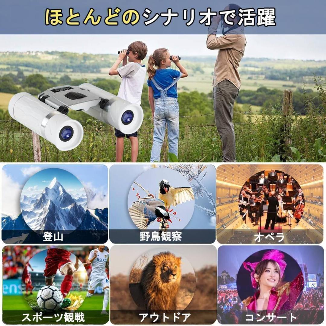 xunbida 双眼鏡 ライブ用 20倍 オペラグラス【2025業界新開発・99.8%透過率・防振・ 超軽量210g】観劇 スポーツ観戦用 コンサート 双眼鏡 25mm口径 BaK4プリズム FMC 酔いにくい 倍率調整可能 目幅調整 手ぶれ補正 生活防水 子供/女性適用 ライブ/オペラ/野鳥観察/登山/アウトドア/旅行 ネックストラップ 収納バッグ付き 日本語説明書(ホワイト)D21 白2025業界新開発の双眼鏡&倍率20倍:xunbida双眼鏡持続的な改良と倍率限界の突破により、快適な視認性と最高の体験を提供するために、最新の20倍超高倍率の双眼鏡が誕生しました。6.5°の超広視野、500m先の人を裸眼で10m先から見るのと同じ大きさで見えるという事。ターゲットを見つけてキャプチャするのが簡単になり。 これからは臨場感も感動も見逃しません。オペラグラス ライブ用&優れた光学構造:双眼鏡のプリズム構造はポロプリズムタイプを採用し、FMCブロードバンド緑膜とBAK4プリズムの組み合わせで、高い集光力と明るい画像を実現しています。双眼鏡の対物レンズ直径は25mmで、光透過率は99.8%に達し、明るさは4.84に達し、光の損失を抑え、暗くなりがちな屋内会場でも、臨場感あふれる明るい視界を楽しむことができます。双眼鏡 ライブ用 ドーム&超軽量&コンパクト:オペラグラスは片手で持ちやすいコンパクトなデザインで、本体重量が210g、手持ちはiPhone16より軽くて 。長時間使用しても疲れません。コンパクトでカバンや首掛けて持ち歩いても邪魔になりません。折りたたむとさらにコンパクトになり、バッグに楽々収納できます。お子様や女性に最適。コンサートやスポーツ観戦、ライブ、オペラ、観劇、野鳥観察などに最適です。生活防水&使用方法:この製品はIPX5の生活防水レベルに達することができます。雪や雨が本体に降っても、乾いたきれいなポリエステルまたは両面フランネルで拭き取るだけで、その後の使用に影響しません。32mmから75mmまでの目幅は調整可能で。たった3つのステップで臨場感あふれる画像を楽しめます。①目幅を調整 → ②ピントリングを調整 → ③視度調整リングを回す。自分に合った目幅に調整できます。双