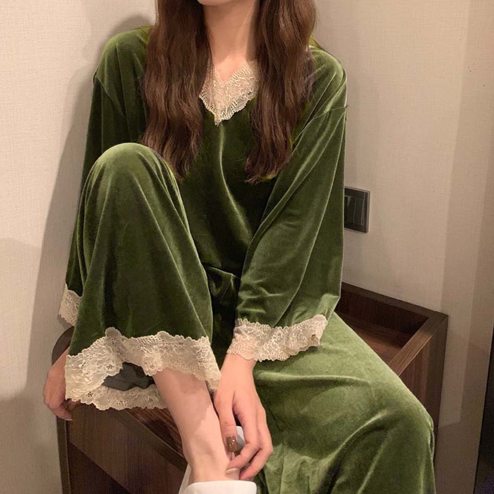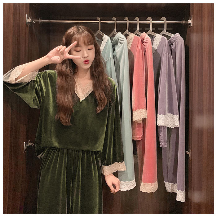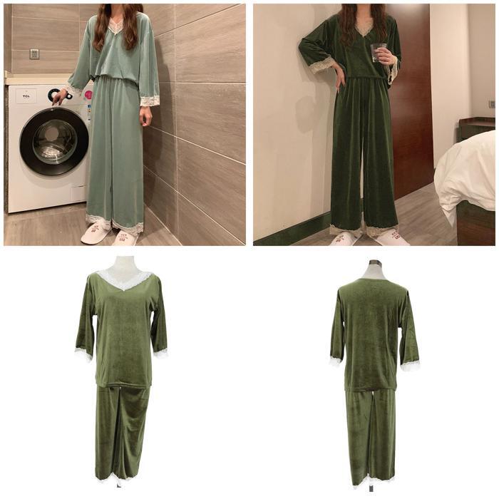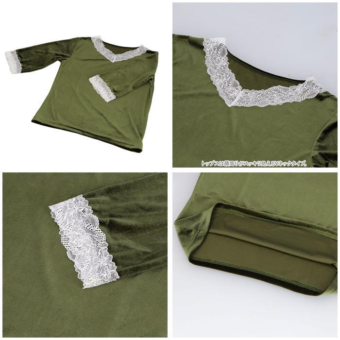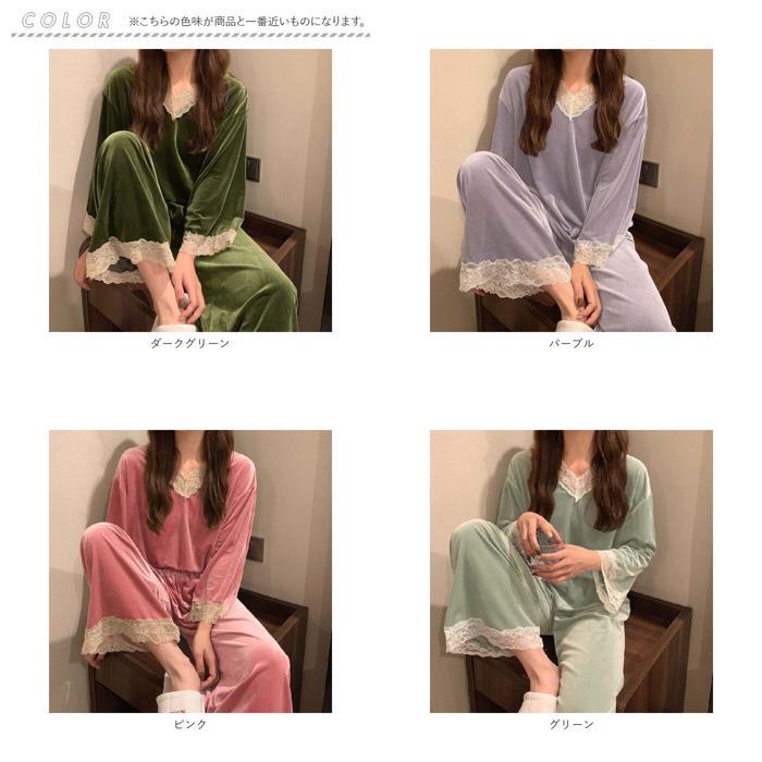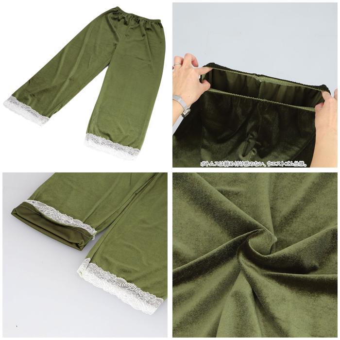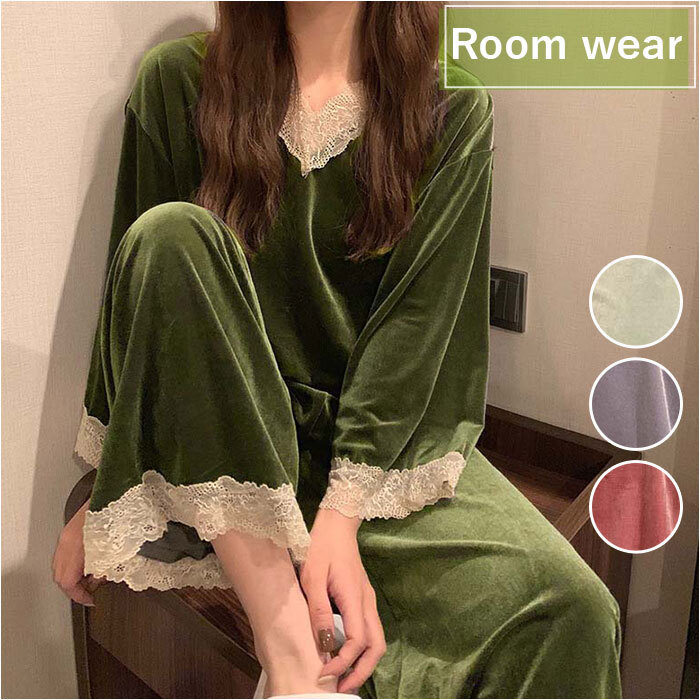 | 商品説明 | ・・リラックスタイムを快適に♪ゆったり着られるルームウェアが登場。 ・光沢感のあるベルベット調素材を使い、上品な印象に仕上げたルームウェア。トップスとボトムスの2点セット。 ・表面は優しく滑らか、裏面はサラッとした手触り。 ・トップスは顔周りがスッキリ見えるVネックタイプ。 ・ボトムスにインしても、そのままでもOK。 ・ボトムスは締め付け感のない、ウエストゴム仕様。 ・トップスの襟元、袖口、ボトムスの裾にレースを施し、可愛さアップ! ・お手持ちのカーディガンなどを羽織れば、ロングシーズン活躍。 |