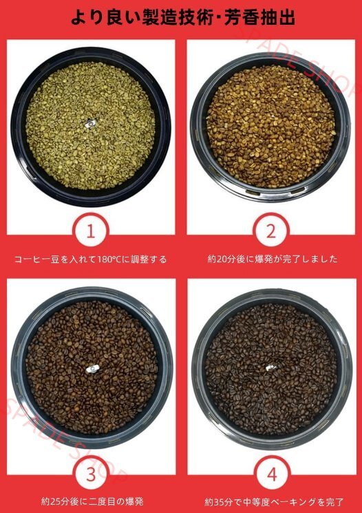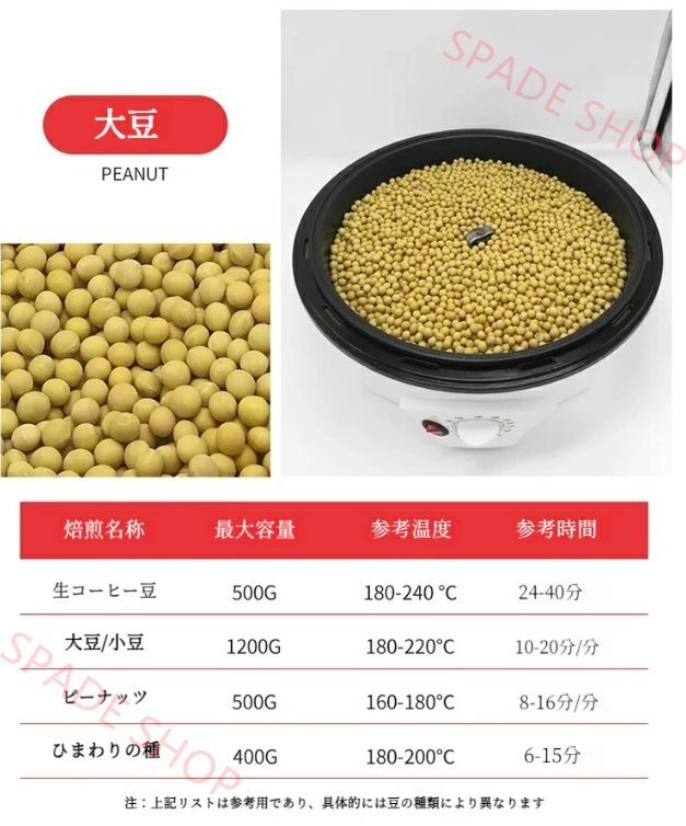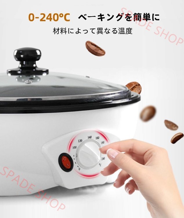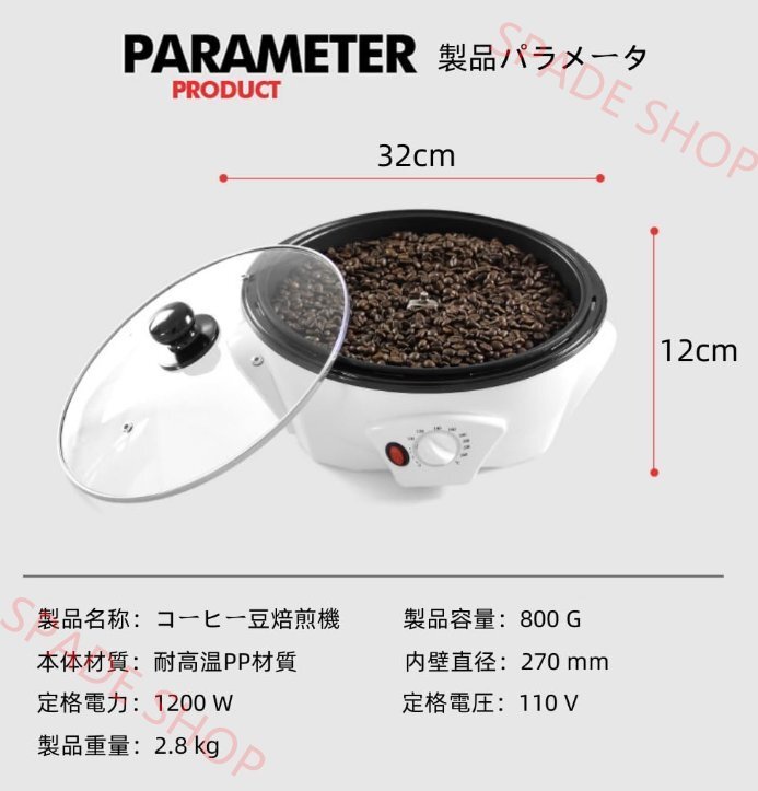 商品の説明仕様: 電圧:110V 内壁の内径:27.2cm 外径:32cm 高さ*12cm 定格電力:1200W ボディ形状:楕円、白 容量:800g 重量:2800g 材質:耐高温PP材質 特徴 透明ガラスカバー: 豆の状態は焼く過程の間いつでも観察することができます。 0~240℃が利用可能です コーヒー豆に応じて、焼きは非常に簡単です、異なる温度を選択してください 【800g 家族用容量】焙煎機は一度に800gまでローストでき、最適なロースト容量は300~500gです。 0~240℃の間で温度調整ができ、異なる品種の豆をローストする場合にも適しています。高温になると火傷しやすくなりますので、お子様を近づけないようにしてください。 【透明カバー】コーヒーロースターの透明カバーには4つの通気孔があり、そこからコーヒー豆の豊かな香りが絶え間なく放出されます。ポンと音がするたびに、コーヒー豆の状態と色を観察でき、タイミングよく温度をコントロールすることができます。 【コーヒーロースト好きになる】コーヒーロースターを所有することは、コーヒー好きになるための必須条件です。自分のコーヒーロースターがあれば、深煎りや浅煎りなど様々な味のコーヒー豆を焙煎できるだけでなく、お店でコーヒー豆を買うお金も節約できます。 【多用途】コーヒー焙煎機がコーヒー豆をローストするだけでなく、ご家族でピーカン、アーモンド、ピーナッツ、ひまわり、ポップコーンなどのローストにもご利用いただけます。このナッツロースターは、ご家族の焙煎ニーズに応えます。 【お手入れ保管が簡単】加熱装置が冷えた後、機械内部の豆チャフや油汚れを湿った雑巾で、蓋は水でお手入れ掃除することができます。本体は32×32×12cm、重さ2.8kg。 乾いたらキッチンカウンターや食器棚に収納することができます。 |