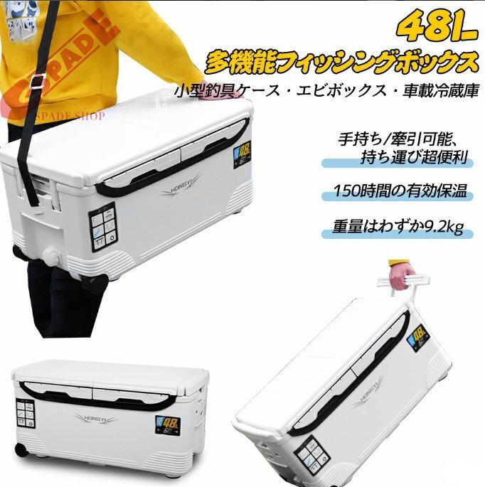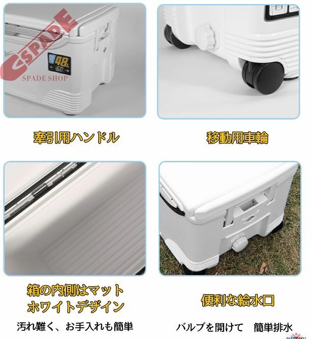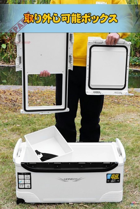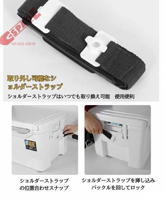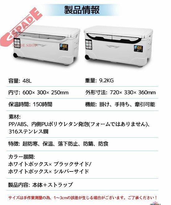 | ■製品情報 容量: 48L 素材: PP/ABS、内側PUポリウレタン発泡(フォームではありません)、316ステンレス鋼 特徴: 超防寒、保温、落下防止、防錆、防食 外形寸法: 720×330×360mm 内寸: 600×300×250mm 重量: 9.2KG カラー展開: ホワイトボックス×ブラックサイド/ホワイトボックス×シルバーサイド 機能: 掛け、手持ち、牽引可能 保温時間: 150時間 製品内容: 本体+ストラップ ★サイズは手作業測量の為、1~3cmの誤差が生じる場合がございます。ご了承ください! |