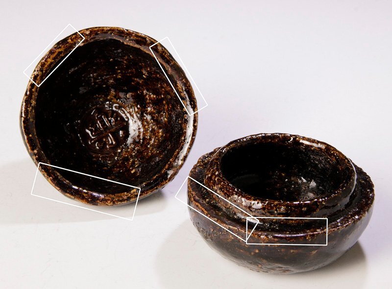・蓋の先端部分に小さな金直しあり ・合口部分に直しあり ・底面に窯キズあり(画像内矢印部分) |