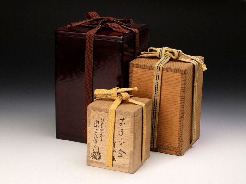 十四代(覚入)識箱/三重野与雲(荊山宗璞)識箱/外箱/仕覆(傷みあり)/即中斎書付 |