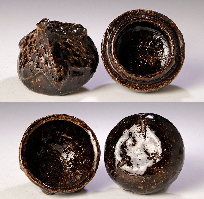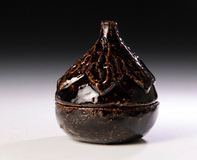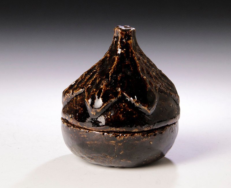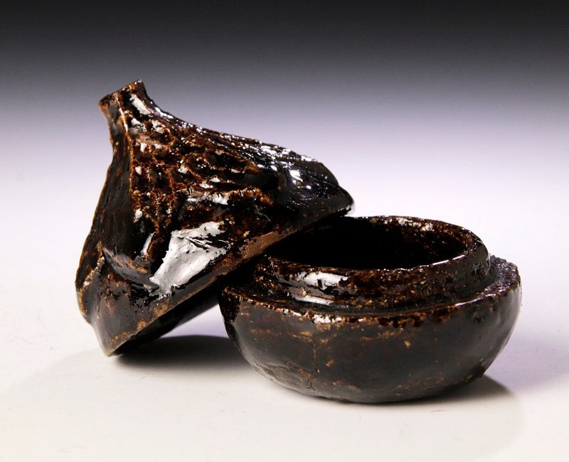 黒の釉が深く沈み、艶やかな光を湛えた茄子香合。 手の中で確かな存在感を放ちます。 その佇まいは穏やかで、茶席に季節の陰影を映し出すかのよう。 掌の中で土の温もりと、時の静けさを感じ取ることができる作品。 ★商品は九代楽吉左衛門(了入)造、即中斎書付、十四代(覚入)/三重野与雲(荊山宗璞)識の作品である事を保証致します。 |