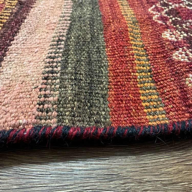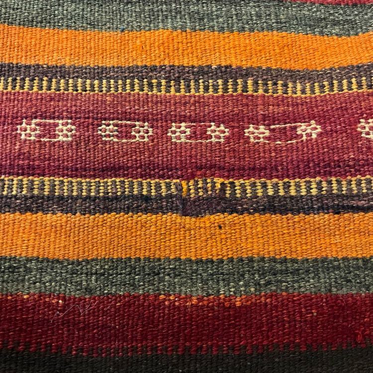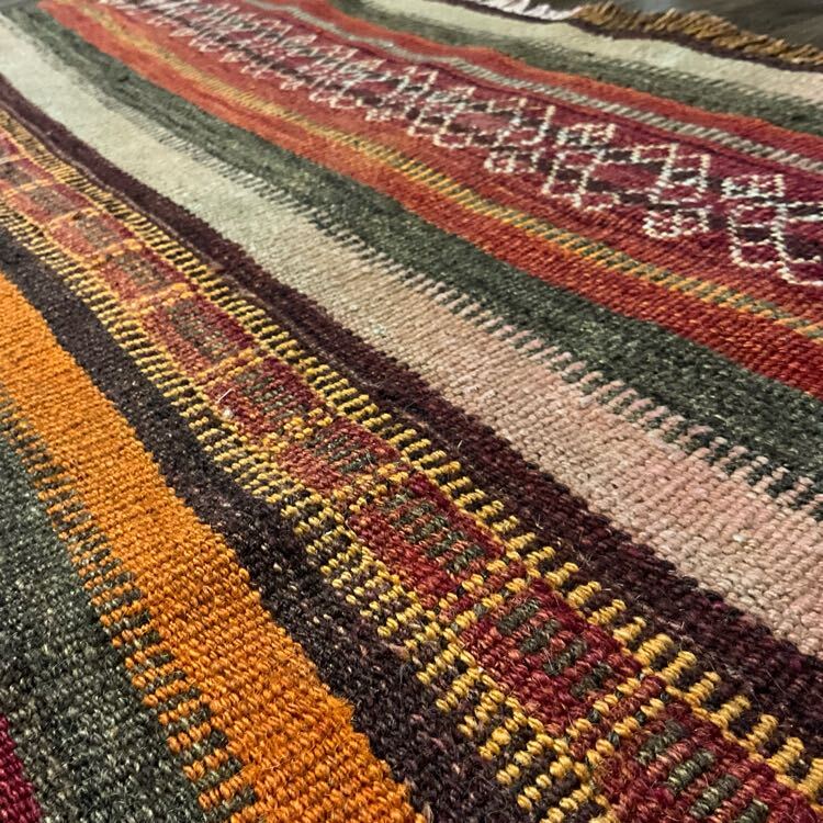 ★大型キリム★下部中央に目立たないリペア痕、経年による擦れがございます。しなやかで丈夫な織り、刺繍のように表現された細かな織り柄が全体に並ぶオススメの一枚です。遊牧民の生活文化に欠かせないキリム。平織りのキリムは肌離れが良く、屋内だけでなくアウトドアでご使用いただいても雰囲気抜群です。(画像をご確認ください。)