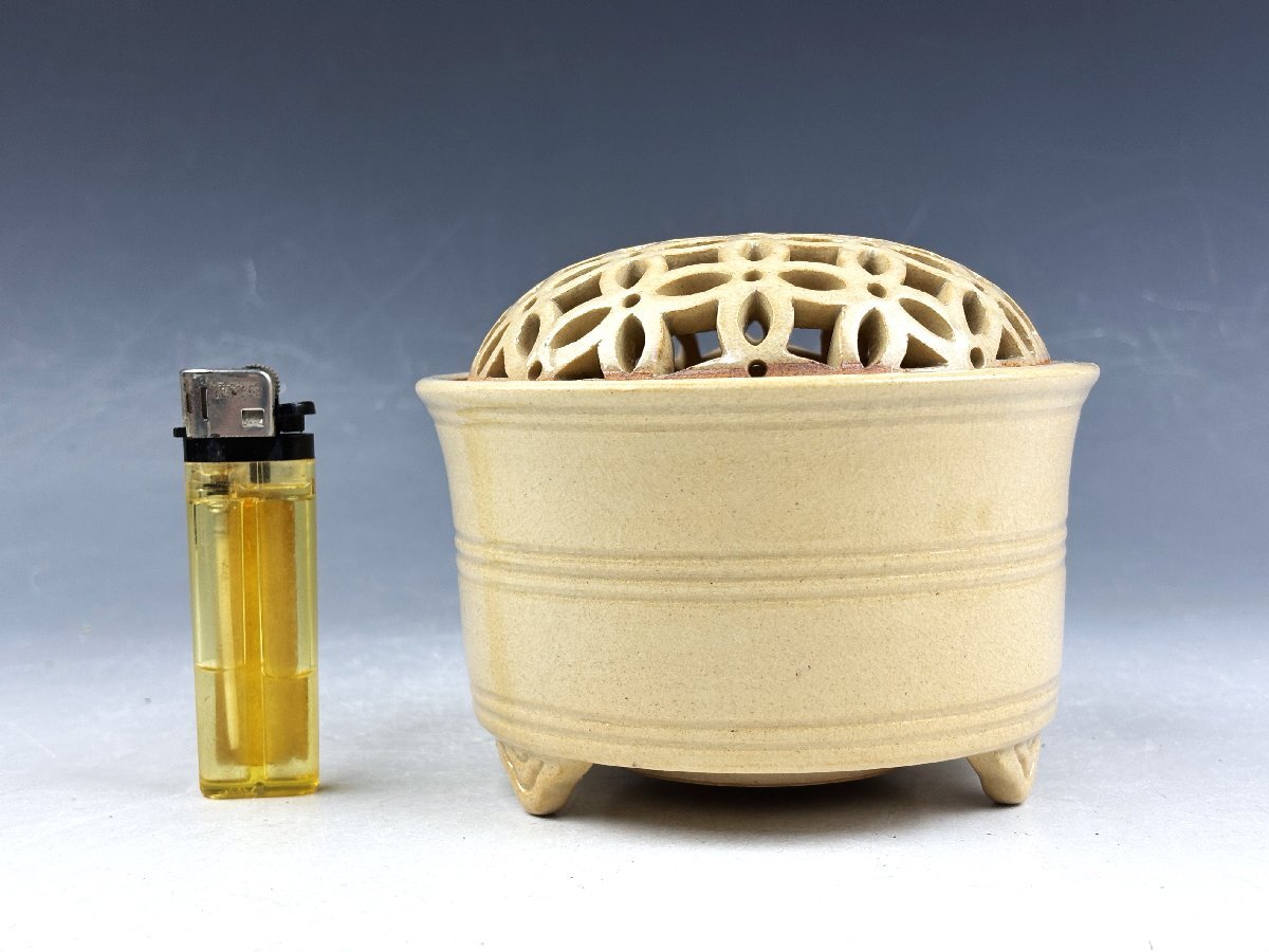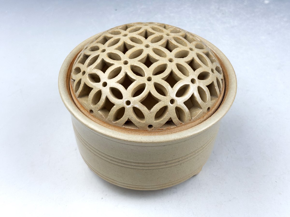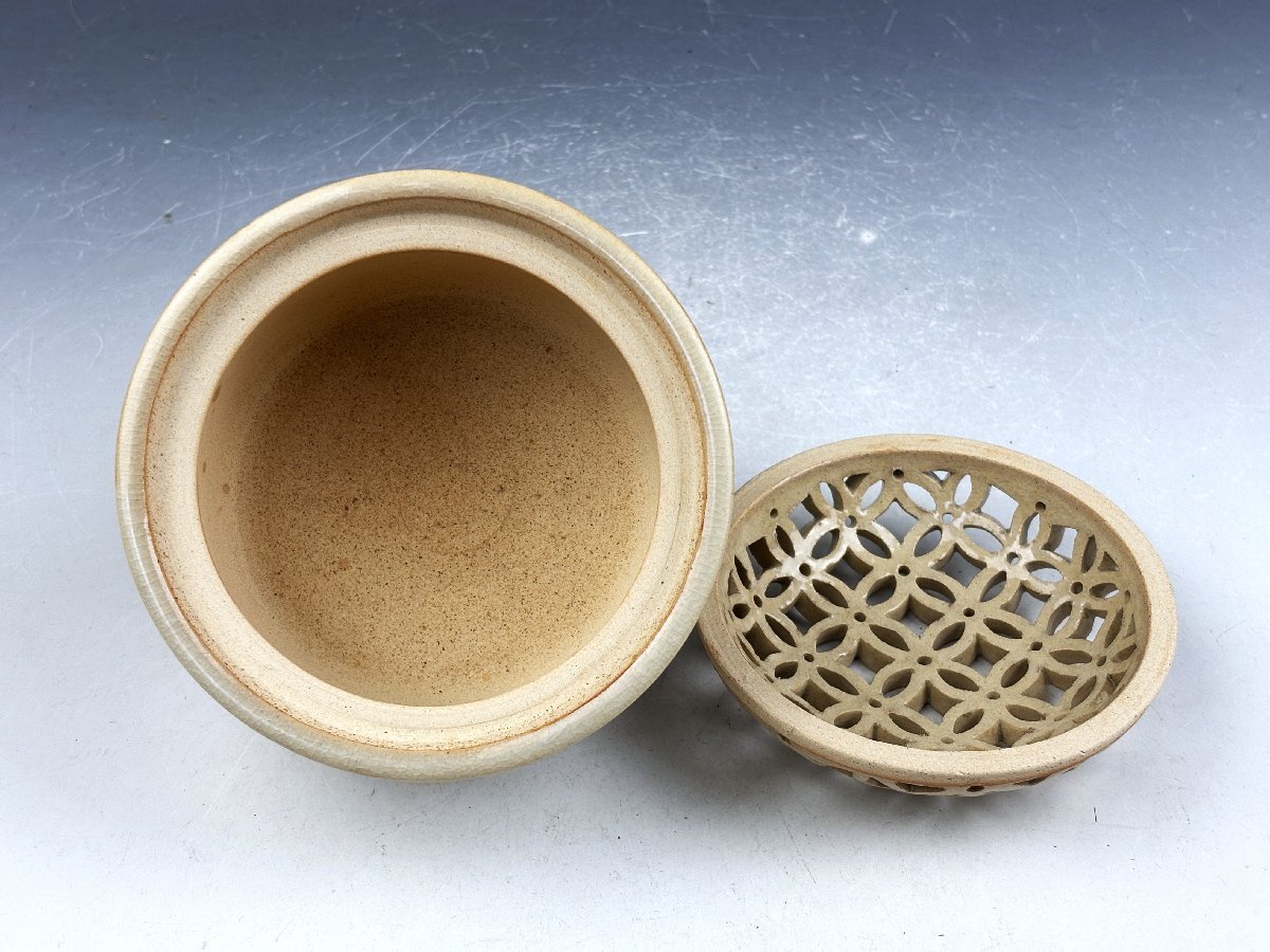 萩焼の名工 山口県指定無形文化財に認定 十三代坂田泥華(十四代天耳庵坂田泥珠)造の香炉です。優しい色合いの肌に七宝文の火屋が施された千鳥香炉形の味わい深い香炉です。