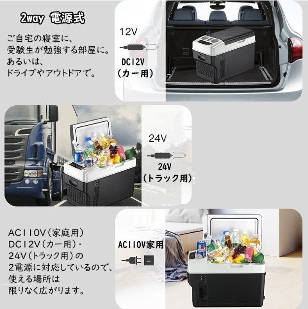 【AC / DC 2電源で室内も車載もOK】普段はお部屋で AC110v電源でお使いいただき、休日のレジャーでは車載の冷温ボックスとして DC12vのカー/24vのトラック電源で使用できます。