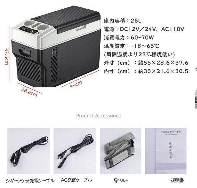 パッケージ内容:26L車載冷蔵庫本体、AC電源ケーブル、シガーソケット電源ケーブル、肩ベルト、説明書。