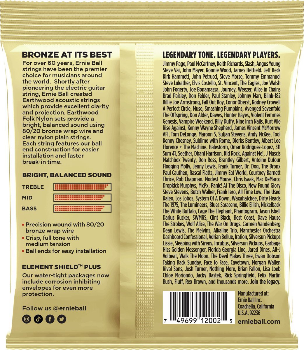 • アースウッド80/20シリーズは、アーニーボールの長い歴史の中で常に高い人気を誇り、アーニーボールの原点ともいえるモデルです。ブラス・メッキされたスティールワイアー・ヘックス・コアに、80%の銅と20%の亜鉛を組み合わせたブロンズのワウンド弦で、明るくハッキリとしたトーンと心地良いサスティーンを特徴にしています。