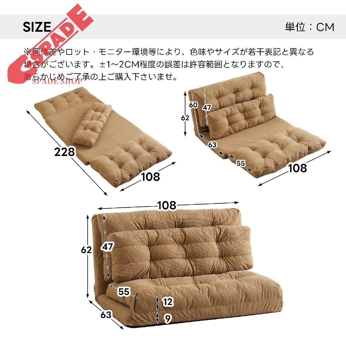 • ★【サイズ】約幅108×奥行き63~228×高さ9~62cm ◆材質:【構造部材】スチールパイプ【張り材】ポリエステル100%又は合成皮革【クッション材】ウレタンフォーム・ウレタンチップ・綿 ◆重量:約13kg(梱包材込み約17㎏)
