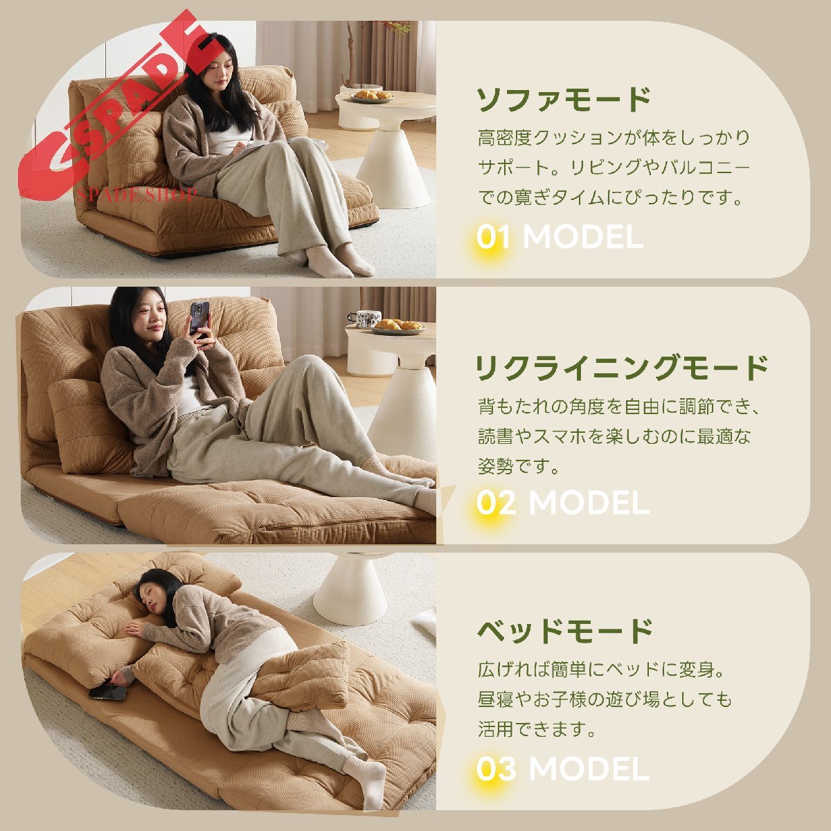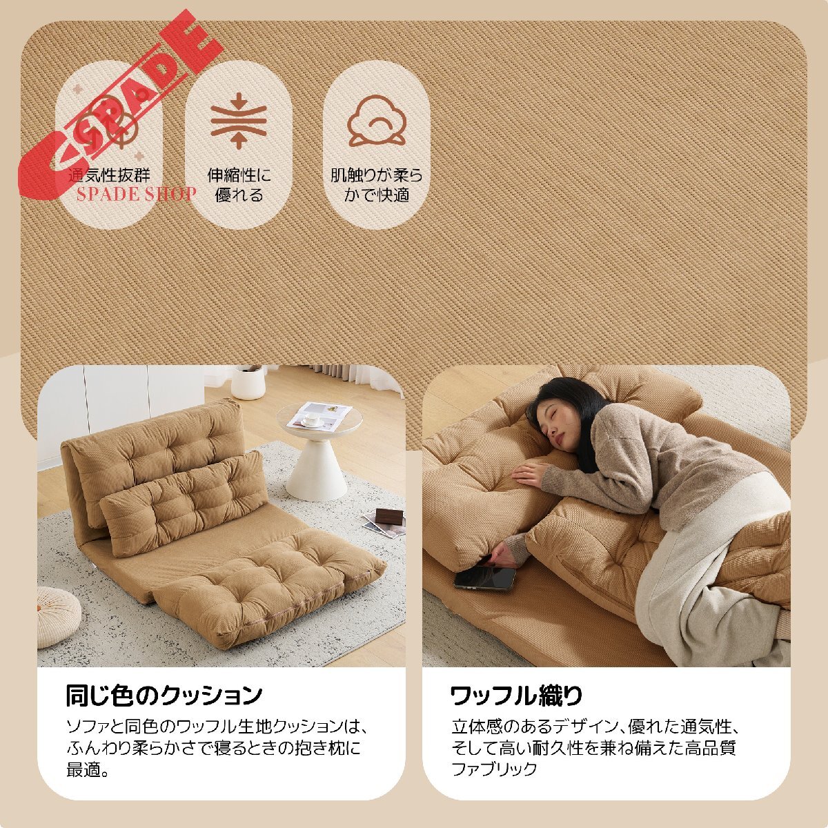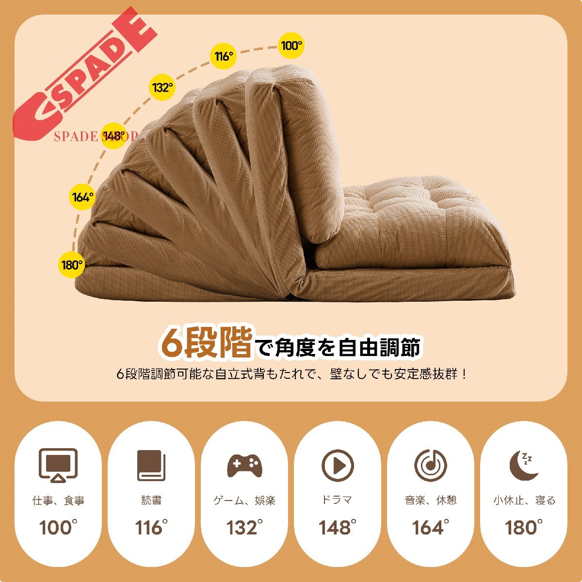 • ★【変幻自在に 自分好みの角度に】背面には6段階のリクライニング調節機能付き。細かな調節が可能なので、体勢に合わせてベストな角度で、ゆっくりと寛げます。さらにソファ時は座面を重ねてボリュームUP。上部のクッションは座った時のふかふか感や気持ちよさを追求。下部のクッションは少し硬めでより長く使用していただく為の 土台の役目を果たします。異なる硬さに設定したことで絶妙な座り心地、寝心地を実現しました。映画鑑賞などのゆったりしたい時はカウチスタイル、急な来客時などは簡易ベッドとして、様々なシーンに活躍します。ソファスタイルでもダブルクッションでゆったりと寛げいただけます。