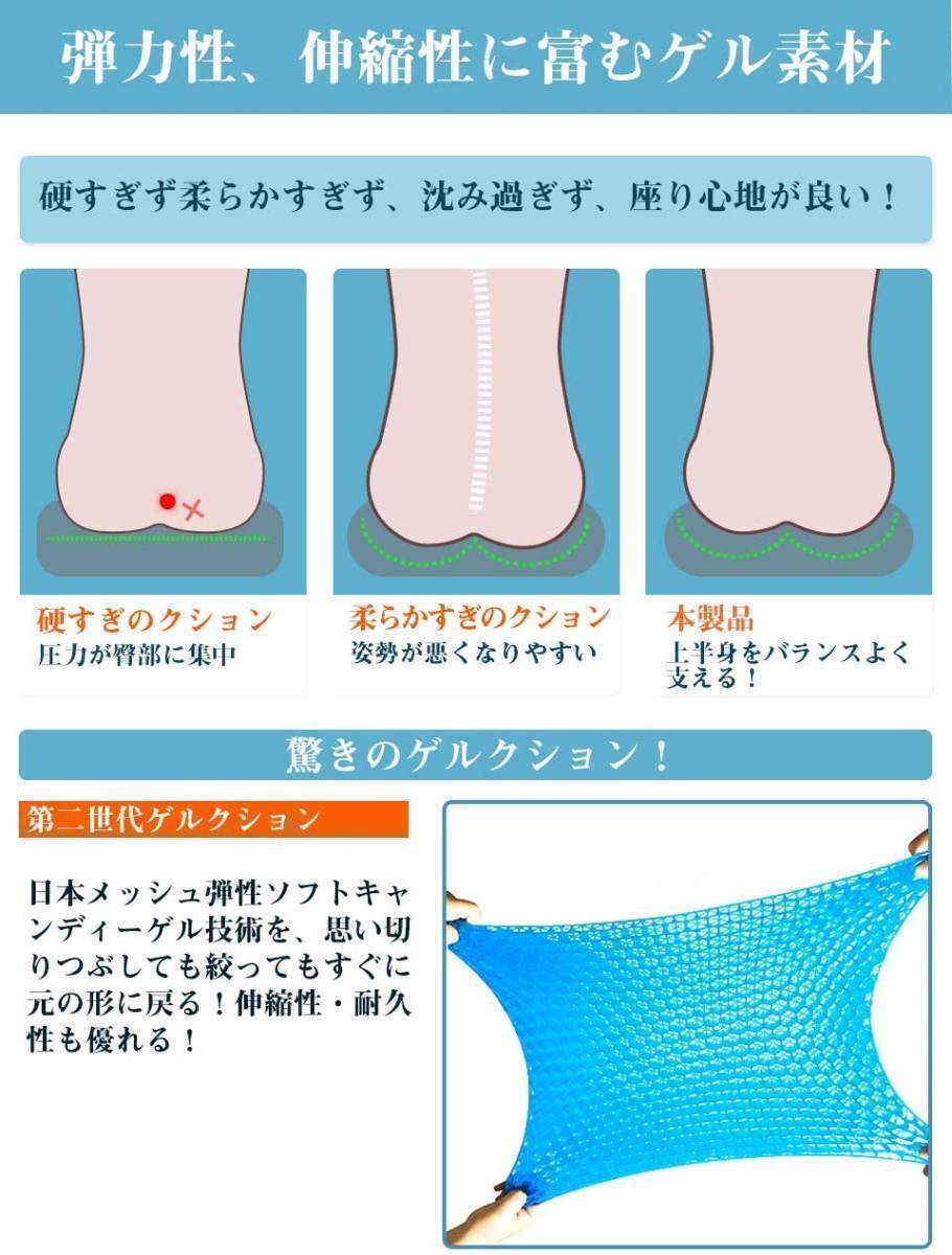第二世代ゲルクッションは非常に丈夫な作りで柔軟性と耐久性が良い。約500個ハニカムと二重設計で良い姿勢を保てる。両面使用可能。