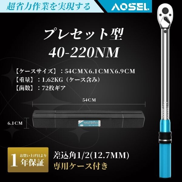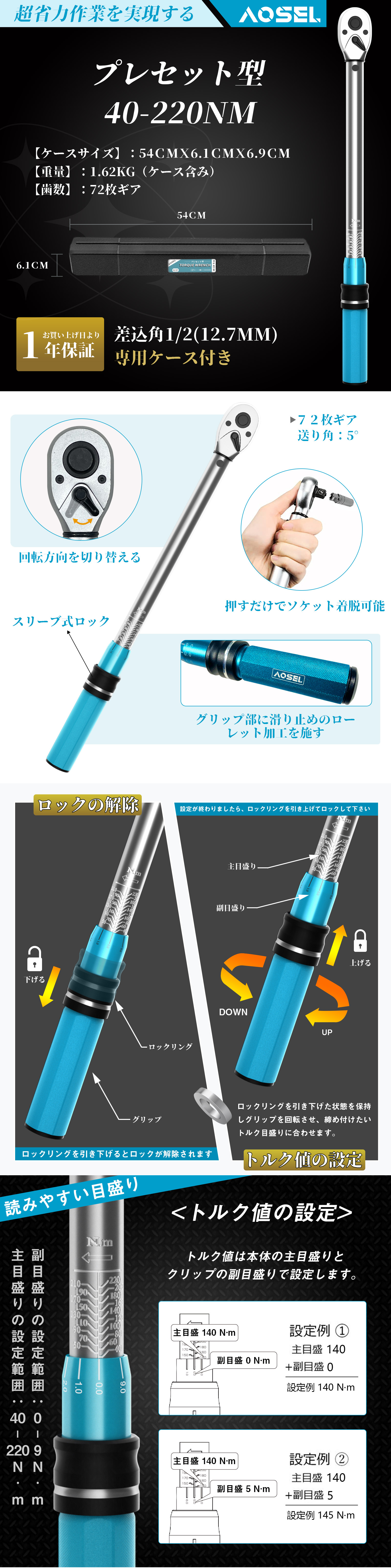 【商品説明】 ------------------------------------------- ▲ 【商品内容】トルクレン差込角:12.7mm 1/2インチ ▲ 【信頼性と高精度】精度は±3%以内でDIN-ISO-6789(国際標準)を満たします。各レンチには検証コードがあり、日常使用には信頼性が高く正確です。 ▲ 【正逆転&読みやすいスケール】作動トルクの安定性を調整した後、ロックできます。正逆転可能なヘッドなので、非常に便利です。設置目盛もほかのレンチよりもっと高精度、細工も精巧でトルク変更、によって容易に行えます。 ▲ 【品質保証と使いやすい】耐久性の抜群である ▲ 【本体】カーボンスチール・スチール。 ▲ 【目盛】はっきりと読みやすい。目盛によってトルク変更は容易に行え!一般人でも使いやすい! ▲本体サイズ:全長490mm 付属品・ケース含:幅535x奥行71mmx高さ65mm ▲トルク設定範囲:40~220N・m。 ▲密閉構造でホコリの侵入が少なく長期間にわたり高精度を保ちます。 |