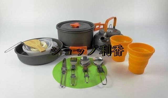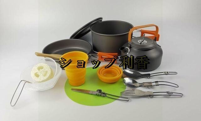 鍋*1,フライパン*1,やかん*1,木製シャベル*1,食品レベルPPお碗*3,スポンジ*1,PPカッティングボード*1,水カップ*2,スプーン*1,テーブルナイフ*1,フォーク*1,ナイフとフォークスプーン*1,小さな布バッグ*1,メッシュバッグ*1