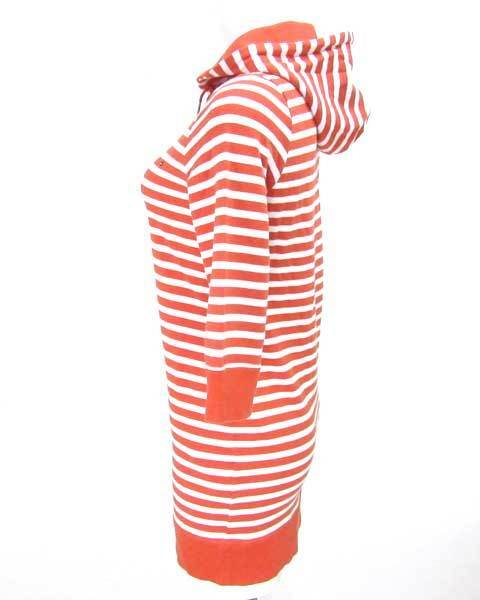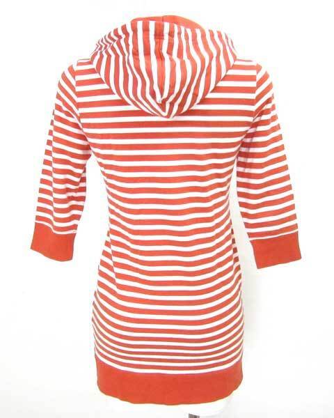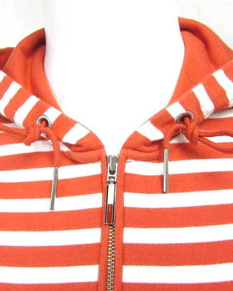 | オレンジと白のボーダーが可愛らしいボーダーチュニック。左胸にはブランドロゴが刻まれております。胸元辺りまでのびるファスナーはよく見るとここにもブランドロゴが。七分袖とヒップがスッポリ隠れるこのデザインは使いやすさ抜群です。 |