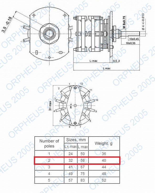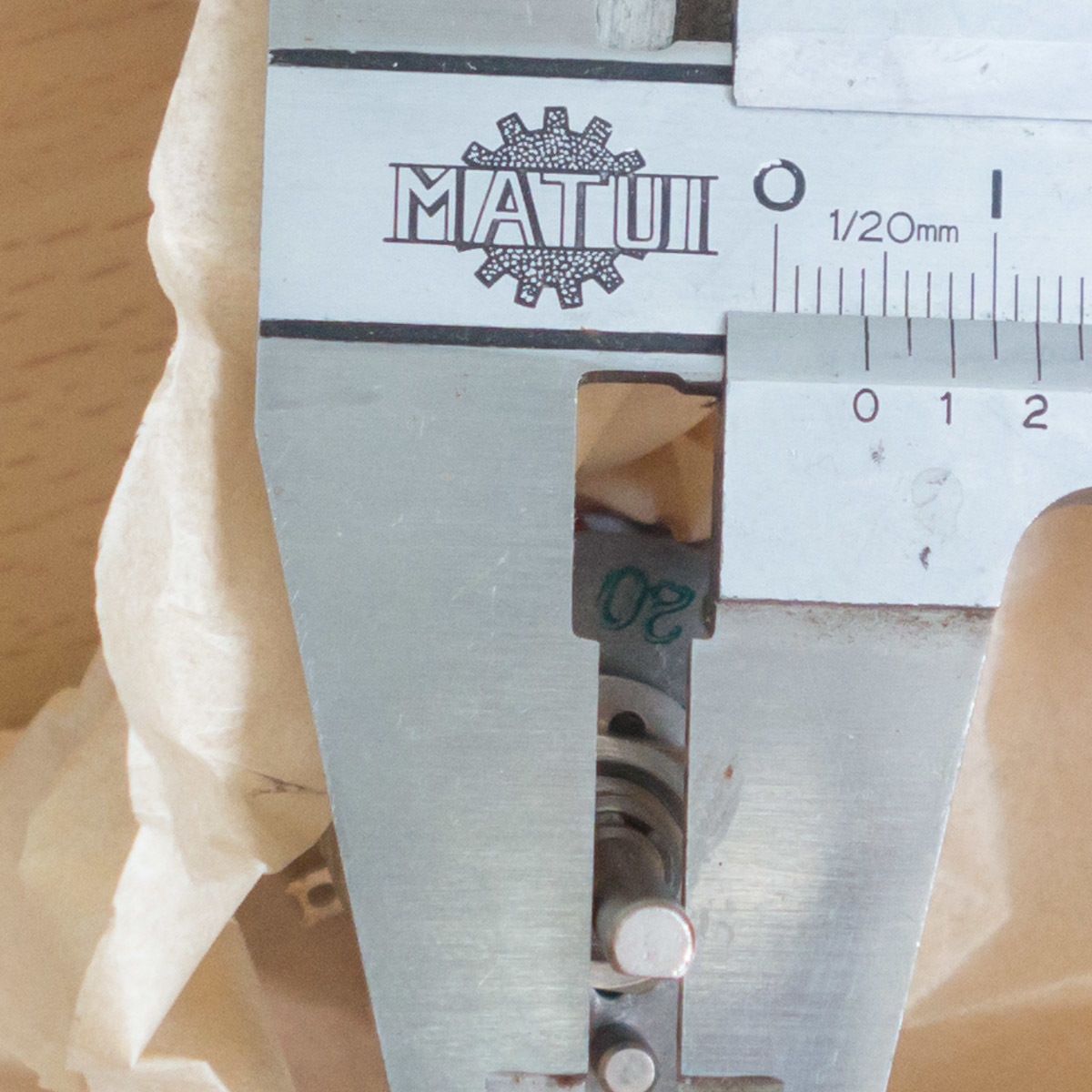 最大径(端子先端から端子先端)約30mm、最大長約55mm、取り付けワッシャーからのシャフト長約25mm、シャフト径約4mm。