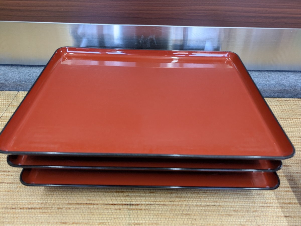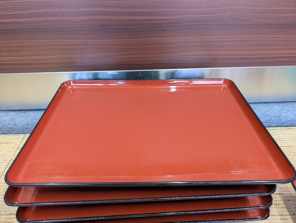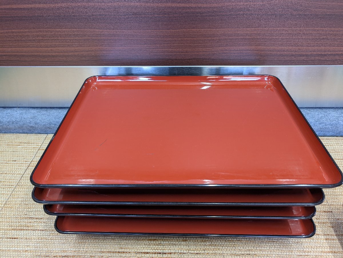 ③中古 折りたたみ式御前 赤 陽光膳 仕出し 会席 祝事 法事 飲食店 御膳台 5点セット 54×39×H22cm