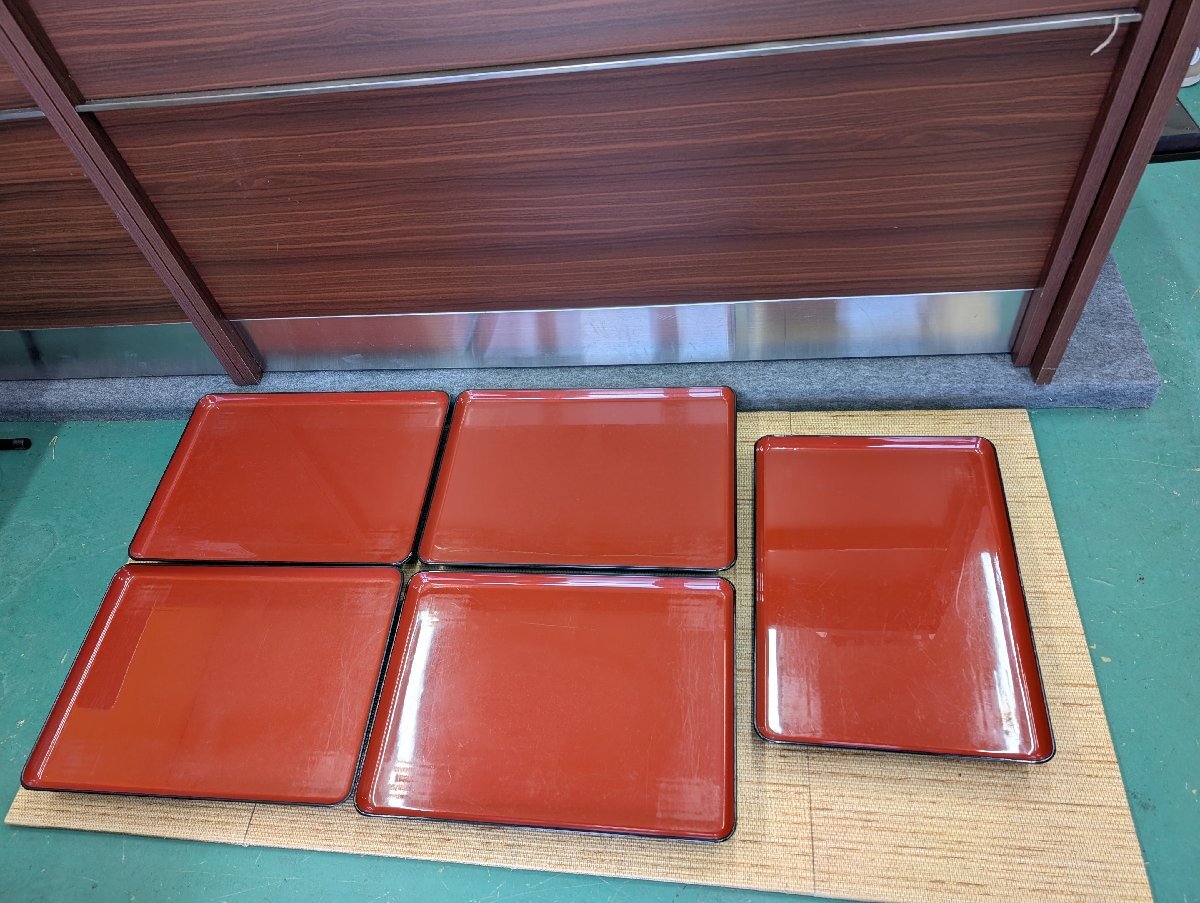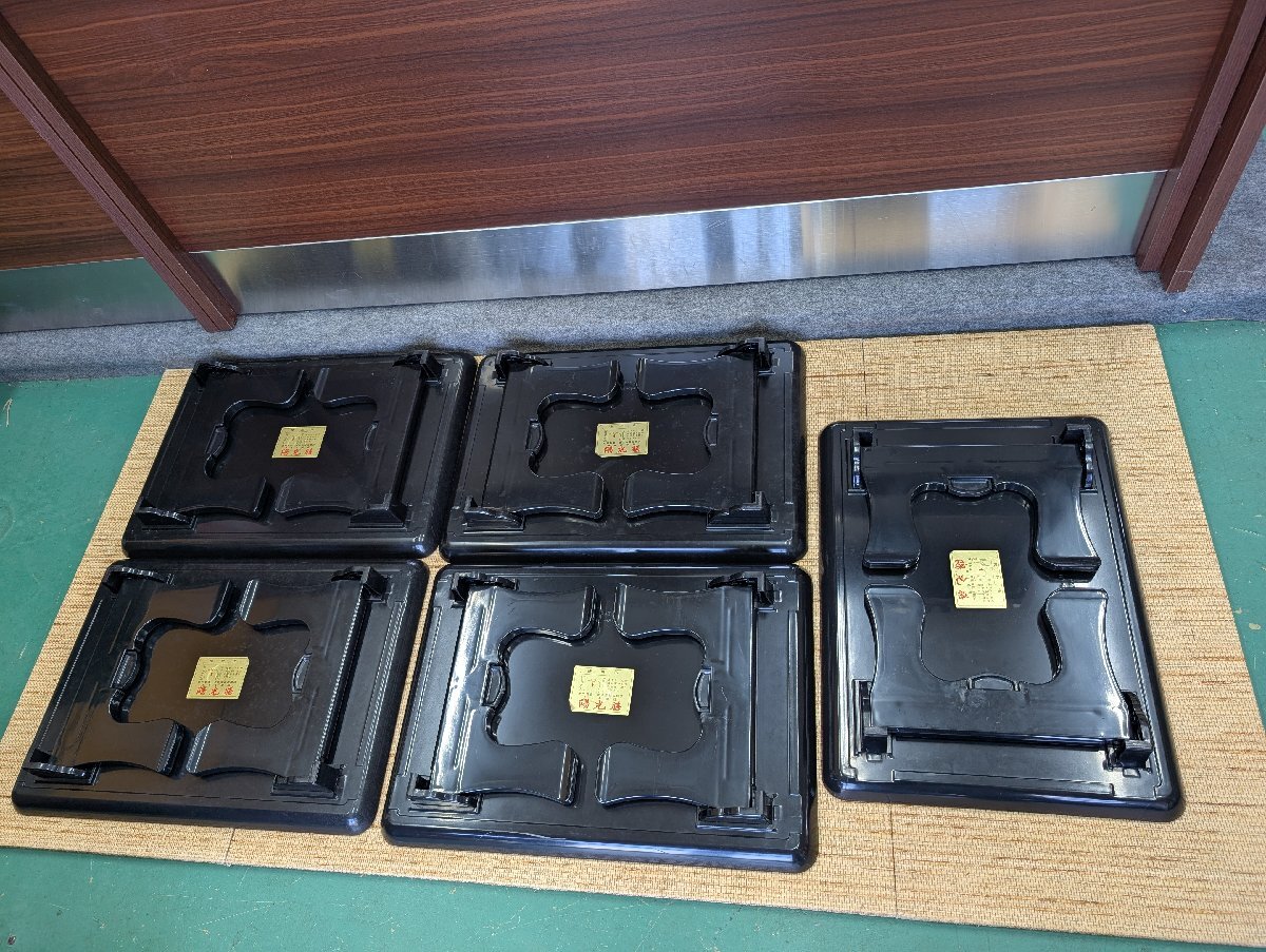 ③中古 折りたたみ式御前 赤 陽光膳 仕出し 会席 祝事 法事 飲食店 御膳台 5点セット 54×39×H22cm
