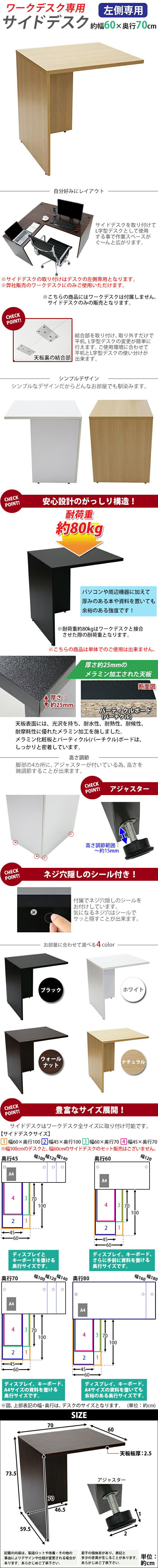 | 商品紹介 | ■弊社販売のワークデスクにのみご使用いただけます。 (こちらの商品は、弊社販売のワークデスクworkdesk,desk07,desk11にのみ使用可能です。) ■作業スペースを広く確保出来る、ワークデスク専用のサイドデスクです。 ■幅が約60cmのタイプです。 ■付属のプレートでワークデスクとサイドデスクを固定するだけの簡単接合。 ■会議室や事務所等、オフィス家具として様々なシーンでお使いいただけます。 ■天板には、メラミン加工を施しています。 ■天板裏の結合金具、ネジ穴隠しのシール付き。 ■アジャスターで高さの調節が可能です。(高さ調節範囲〜約15mm) ※こちらの商品は、組立て式です。組立てにはプラスドライバーが必要です。お客様でご用意ください。 ※組立図が付属します。 ※サイドデスクの取り付けはデスクの左側専用となります。 ■材質:パーティクル(パーチクル)ボード(メラミン加工)(本体)、プラスチック(アジャスター) ■重量:約16kg ■耐荷重:約80kg(ワークデスク接合時) ●新品商品ではありますが、輸入商品の為、多少の擦り傷などがある場合がございますので、ご納得の上ご購入下さいませ。 ●ご購入後、お客様ご都合によるご返品、ご返金等は一切お受け致しておりません。 ●本商品を使用した際に発生したトラブル、事故につきまして、当社は一切の責任を負いません。ご使用に関しましては、全て自己責任にてお願い致します。 ※カラーはナチュラルとなります。 |