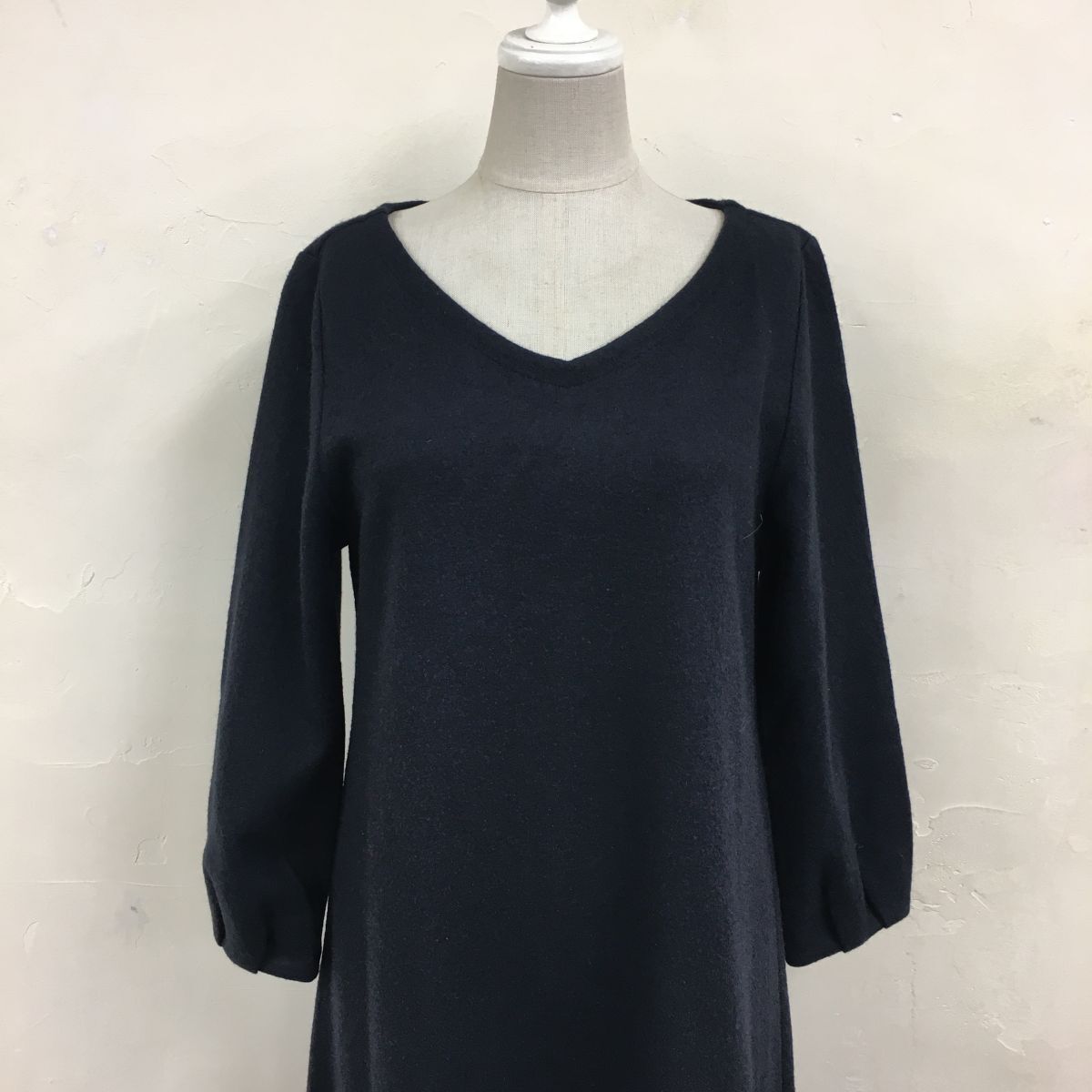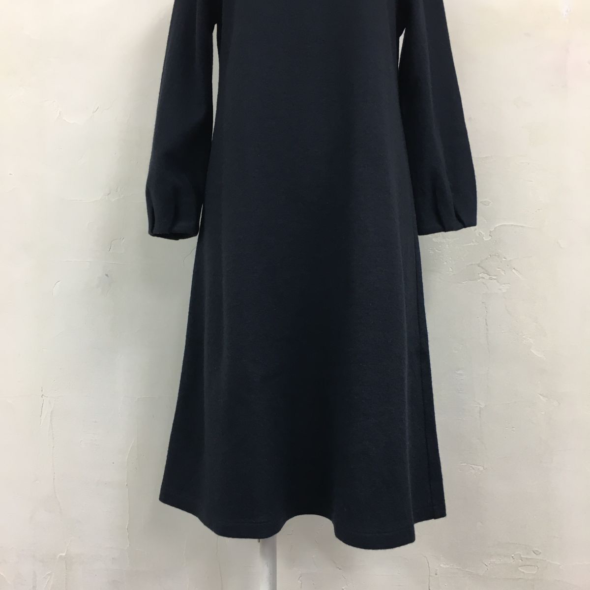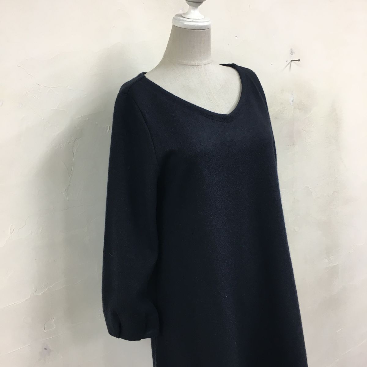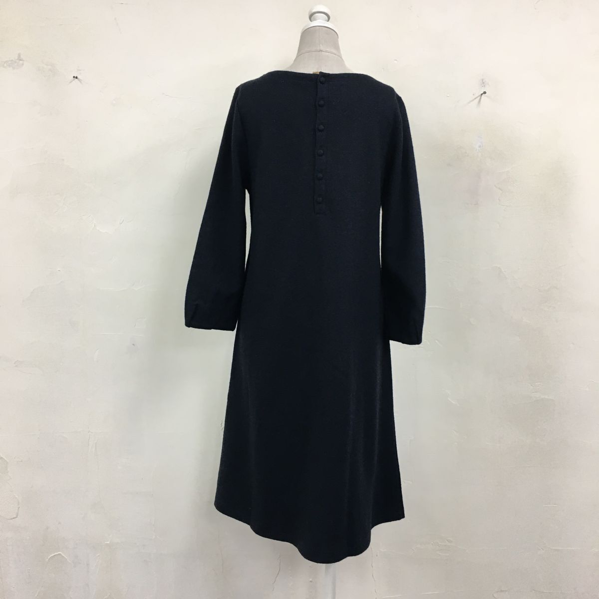 2N1276-G◆ NIMES ニーム バックボタンウールフェルトミドルフレアワンピース Vネック タックスリーブ 無地 Aライン ◆ ネイビー 毛