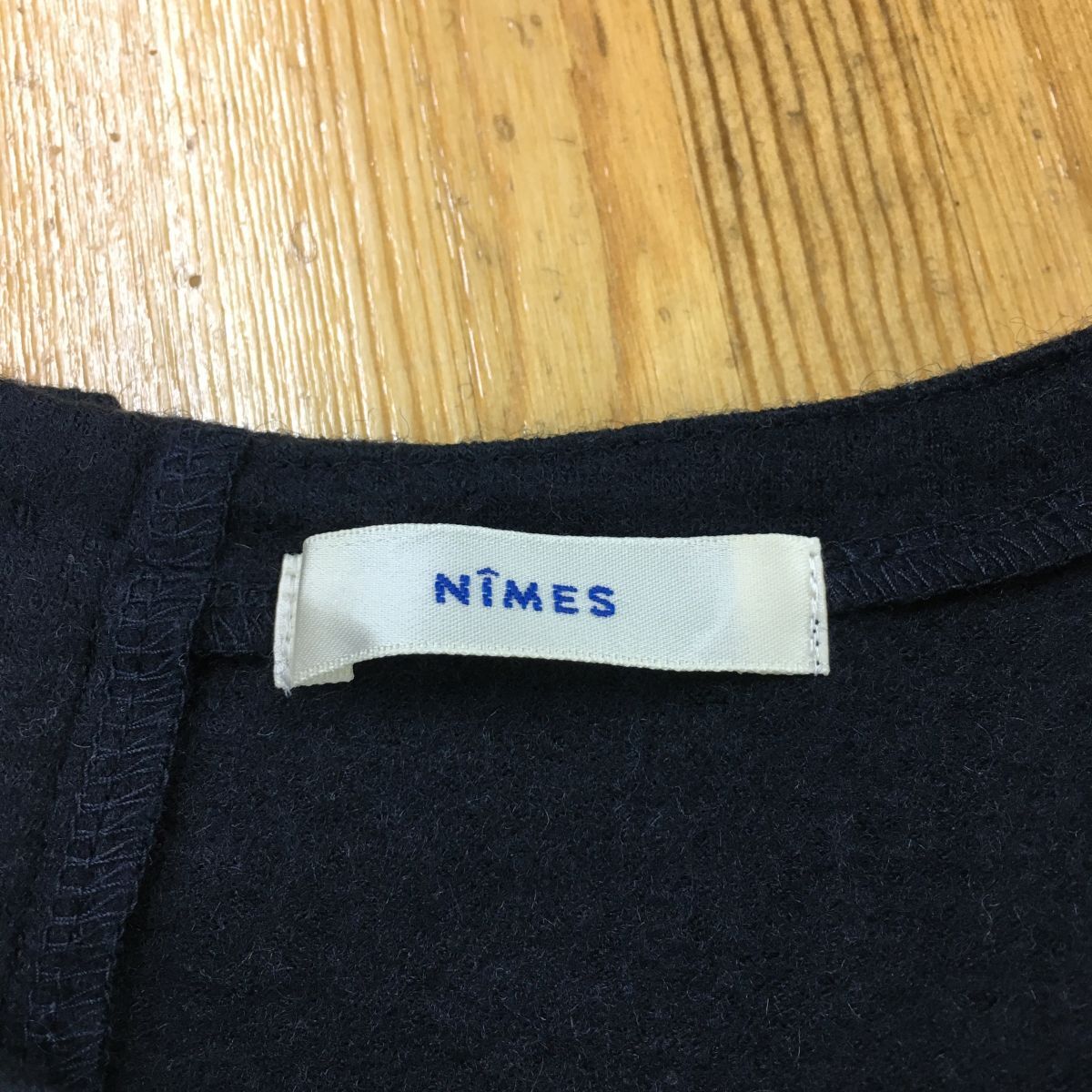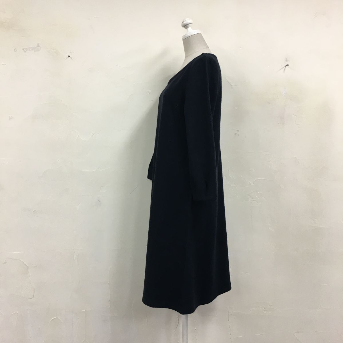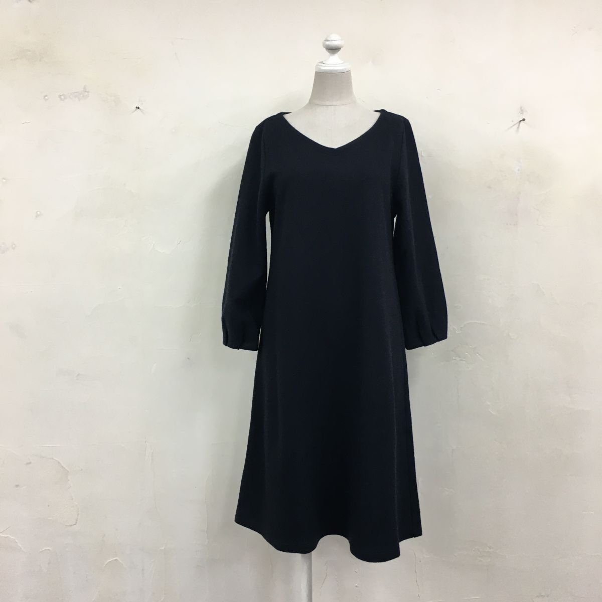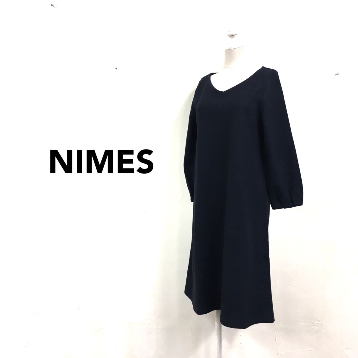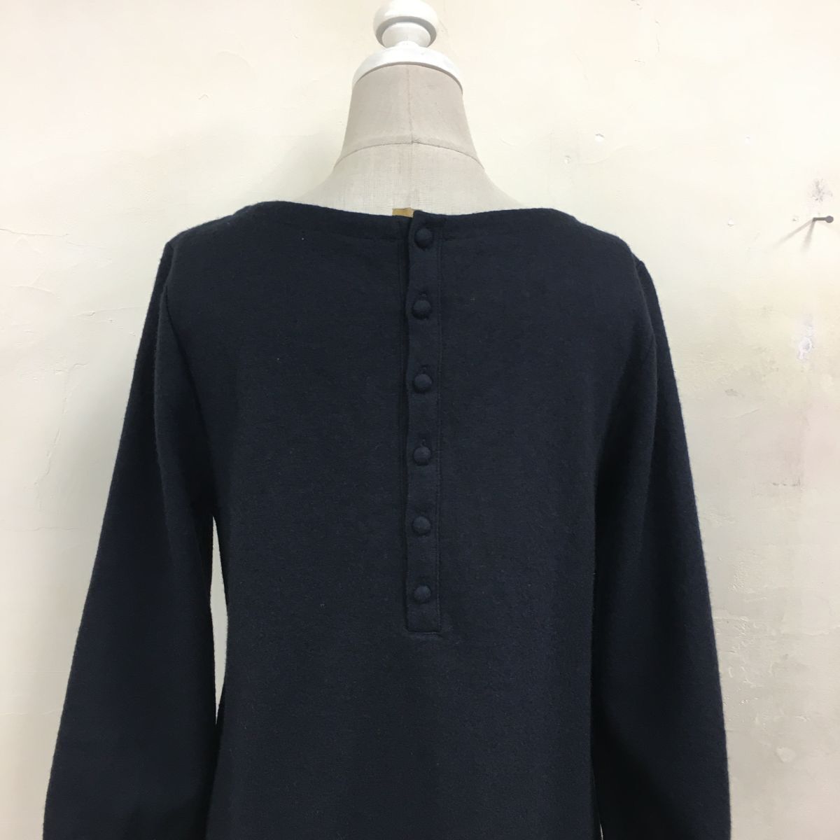 2N1276-G◆ NIMES ニーム バックボタンウールフェルトミドルフレアワンピース Vネック タックスリーブ 無地 Aライン ◆ ネイビー 毛