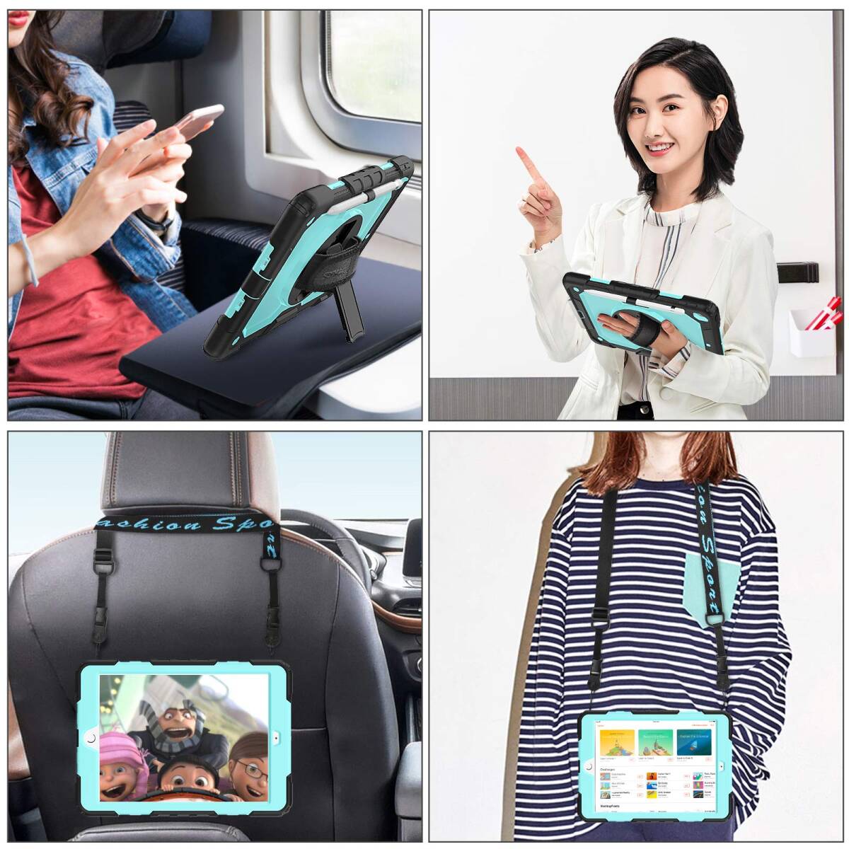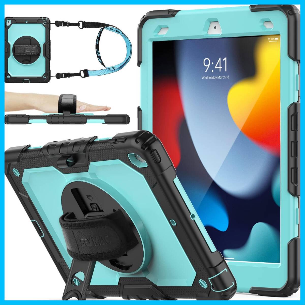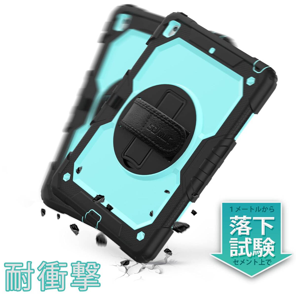 SEYMAC stock iPad 10.2インチ 第9世代/第8世代/第7世代 ケース 耐衝撃 保護フィルム付き ペン収納 360°回転スタンド ハンドストラップ ショルダーストラップ 全面保護カバー (スカイブルー+ブラック)