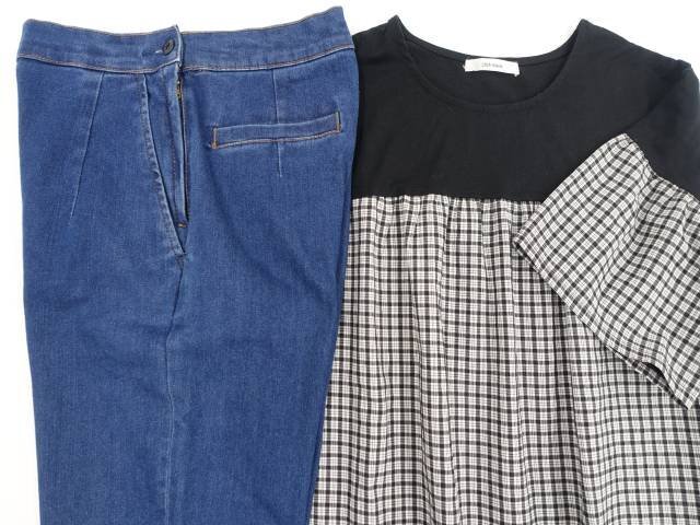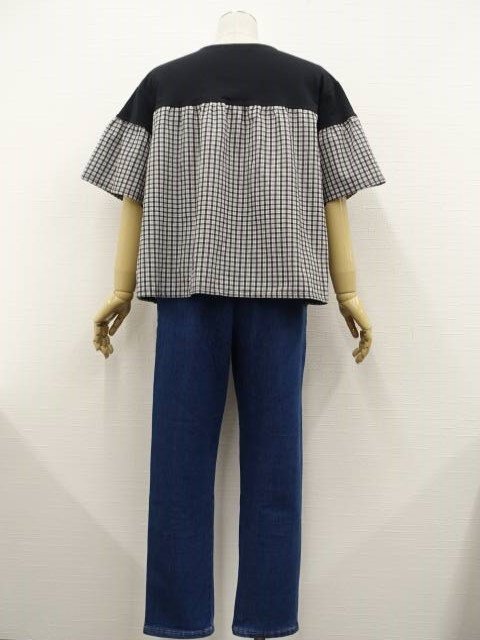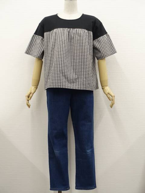 洗える五分袖カットソー+デニムテーパードパンツ コーディネート上下2点セット M相当 ブラック&ブラック×ホワイト チェック柄/インディゴブルー カジュアル系 20代~