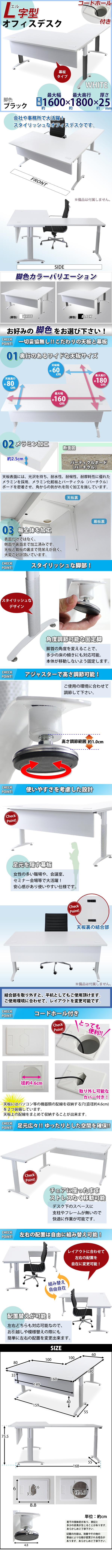 | 商品紹介 | ●●L字型オフィスデスク●● ■スタイリッシュなデザインかつ、作業スペースを広く確保出来る、L字型オフィスデスクです。 ■会議室や事務所等、オフィス家具として様々なシーンでお使い頂けます。 ■天板と幕板は、表面に加えて側面や裏面まで加工を施しています。 ■天板にはコードホール付き。 ■全ての前脚先には角度調節可能な固定脚を採用。 ■足元を隠す幕板付きなので、女性が多いシーンでも大活躍!安心してご使用頂けます。 ■足元に支柱やフレームが無いので、チェアに座ったまま快適に作業出来ます。 ■左右の組み替え自由自在!配置替えが可能です。 ■日本語組立て書付き。 ■材質:パーティクル(パーチクル)ボード(メラミン加工)(天板、幕板)、スチール(フレーム)、プラスチック(脚裏) ■重量:約53kg ■付属品:工具(六角棒レンチ×2) ※こちらの商品は、組立て式です。 (組立てには付属工具とプラスドライバーや電動ドリルが必要です。プラスドライバーや電動ドリルはお客様でご用意下さい。) ●脚色のカラーはブラックとなります。 |