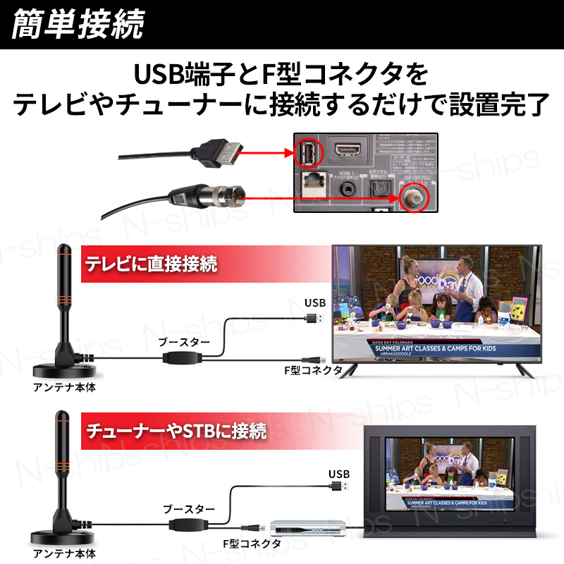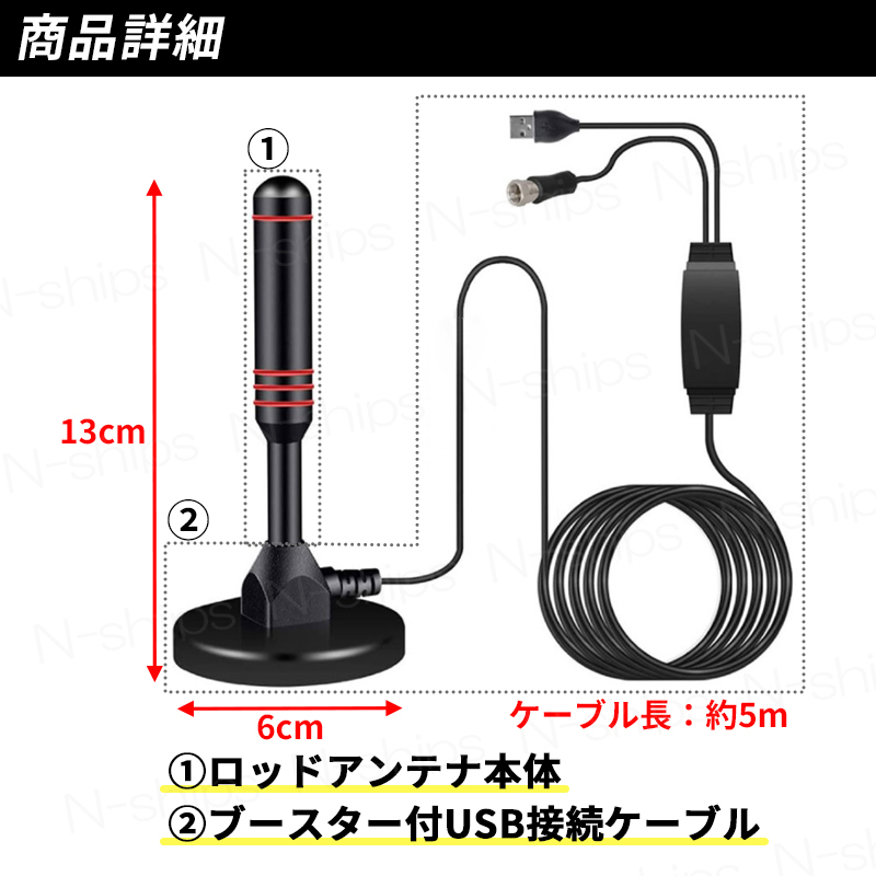 ブースター内蔵の高感度アンテナタイプなので フルハイビジョンでお好きな番組を簡単に視聴可能! ペーパーアンテナとは異なり、自由に移動可能で、 5mの付属ケーブルを利用して、 様々な場所で受信感度の調整を行うことが出来ます。 アンテナ本体の底面には磁石が内蔵されているので 金属面に簡単に取り付け可能。 車載などにも便利で設置場所の幅が広がります。 テレビやチューナー、STBなどに接続し、 USB給電ケーブルを接続するだけの簡単設置! 室内アンテナの受信可能エリアの目安は下記サイトで確認可能です。 https://tv-area.jp/#/ ■商品仕様■ ●ゲイン:30dBi ●受信周波数帯域 VHF:174MHz~230MHz UHF:470MHz~862MHz ●インピーダンス:75Ω ●ケーブル長:5m ●電源供給:USB給電 ●コネクタ:F型コネクタ ■商品内容■ ●ロッドアンテナ本体 ●USB接続ケーブル 5m | |||