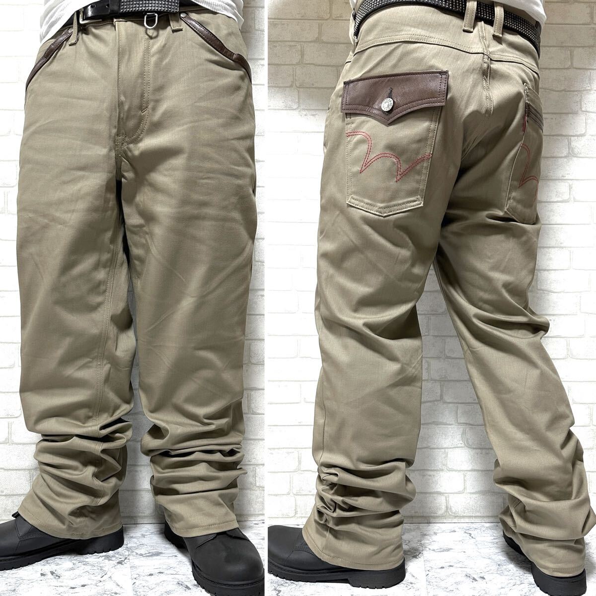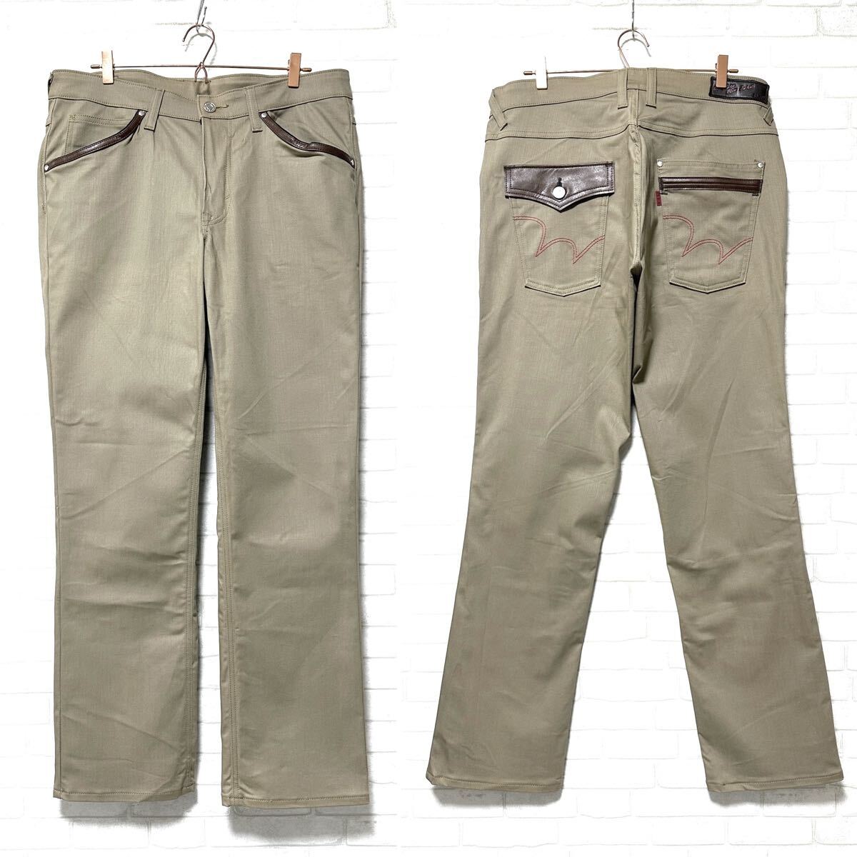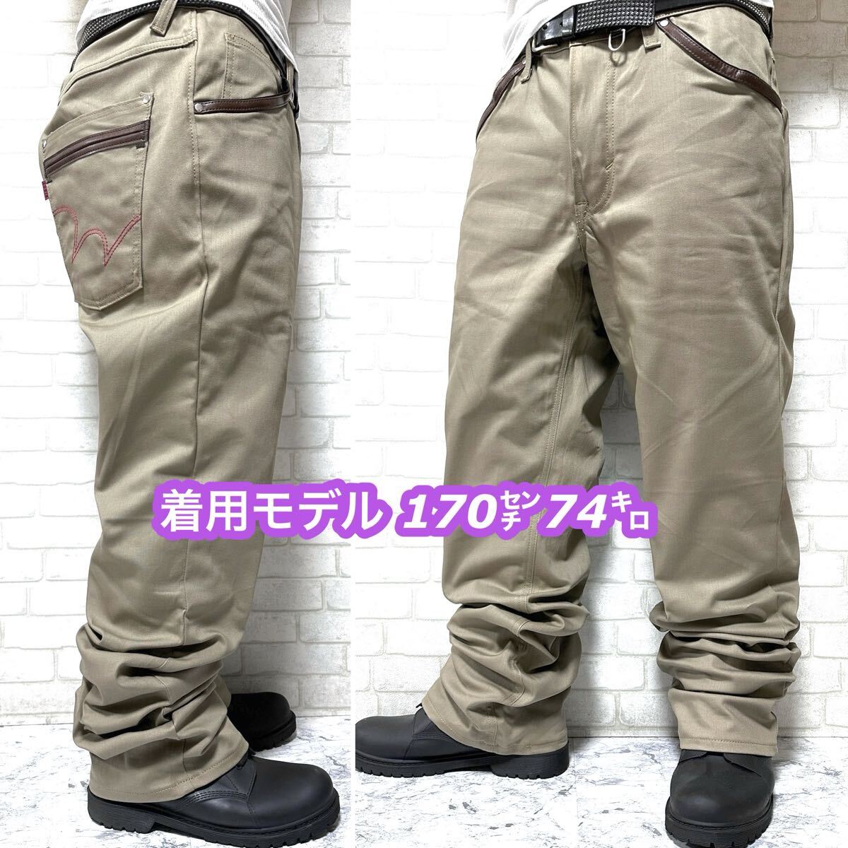 ☆W36・97cmのビッグシルエットの一本。また、ストレッチ素材を使用した伸縮性のある快適な穿き心地◎更にポケット縁にはPUレザーの装飾、バックにはフラップポケットや二重構造のポケットを配置したこだわりの詰まったボトムスです。