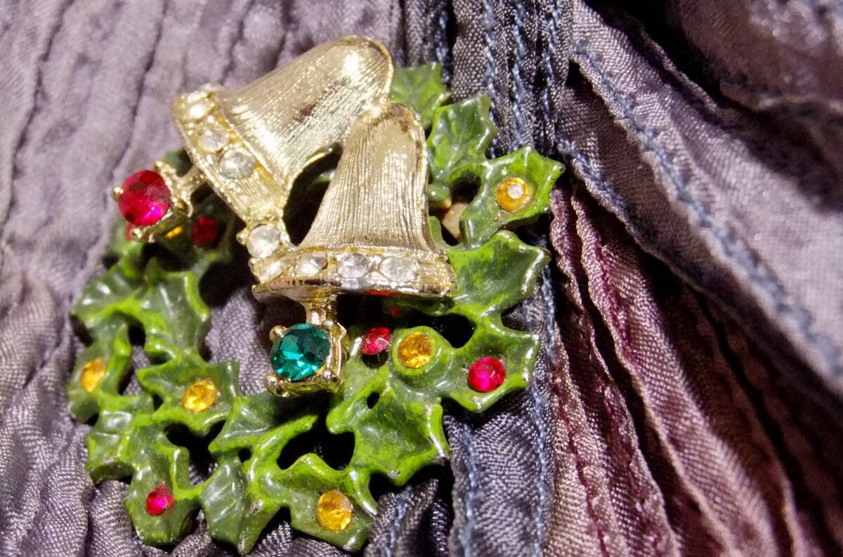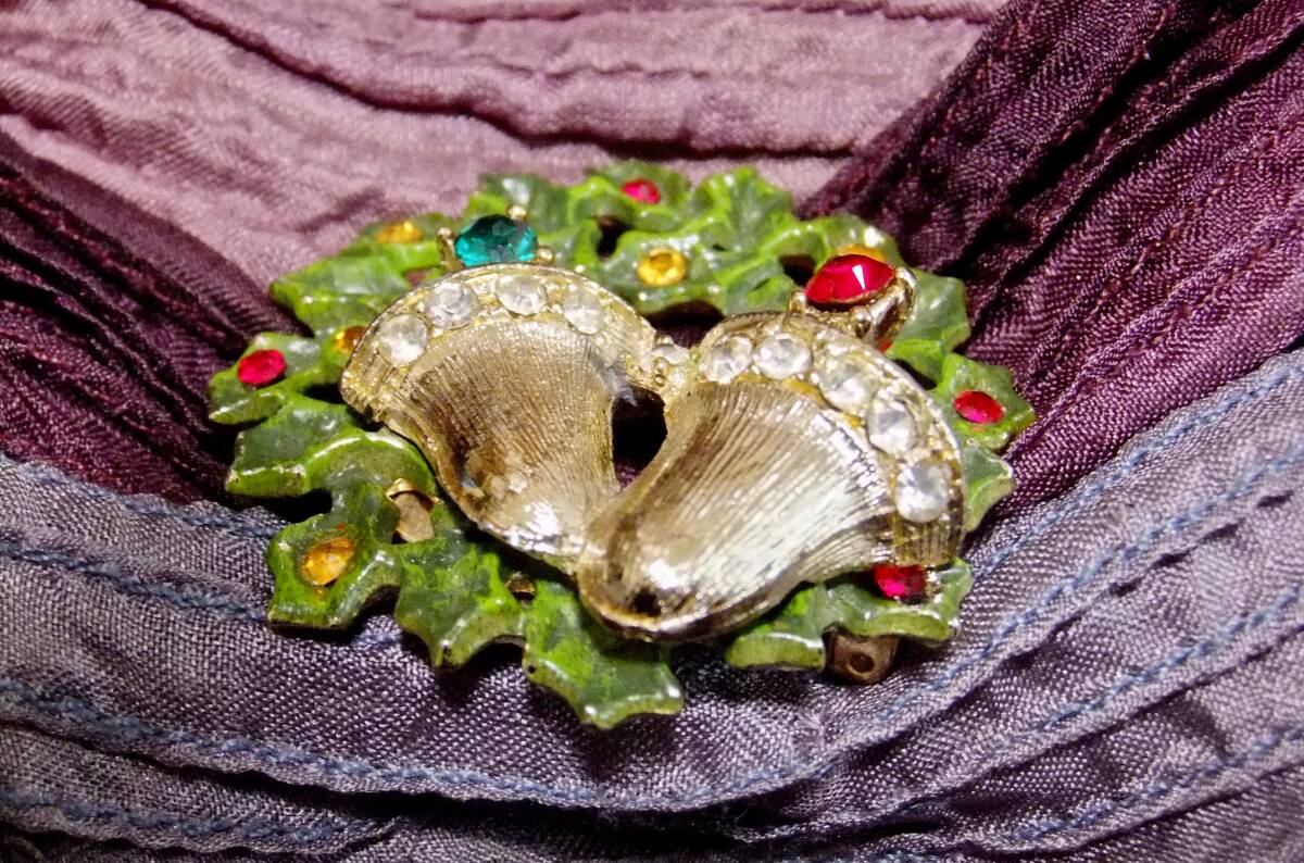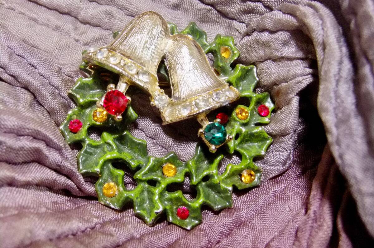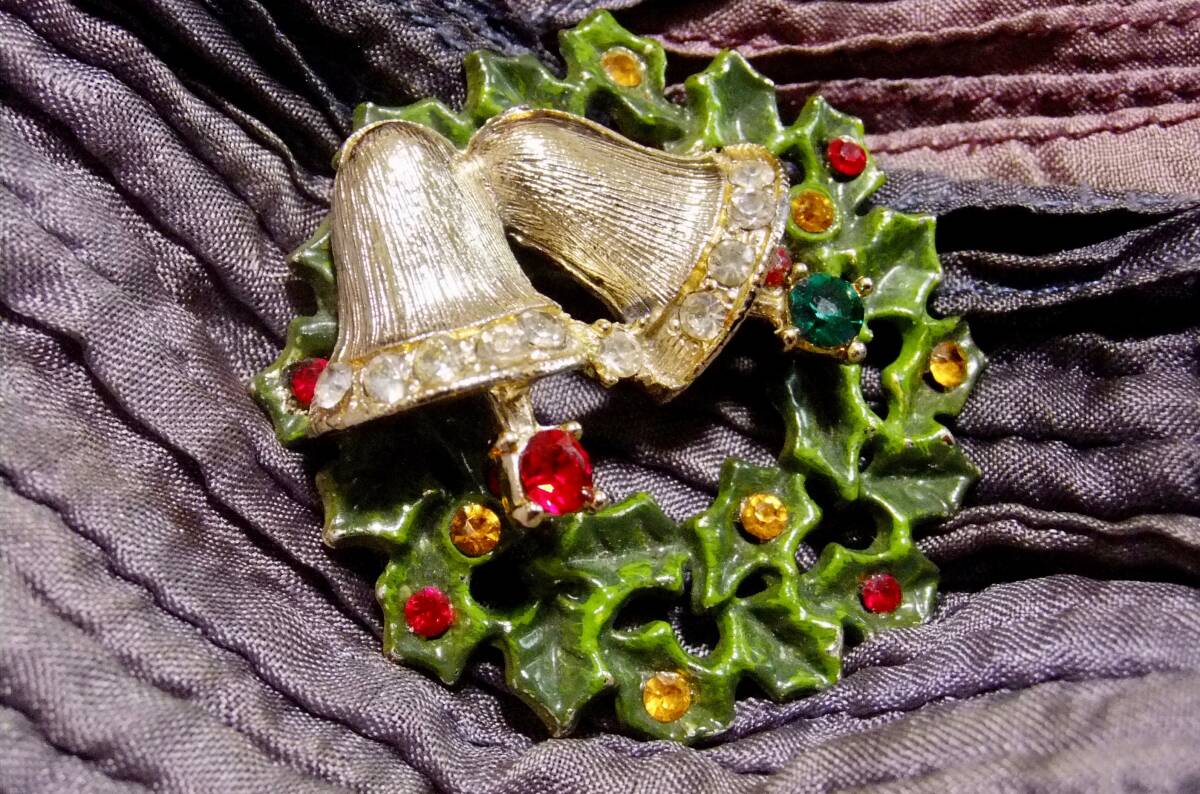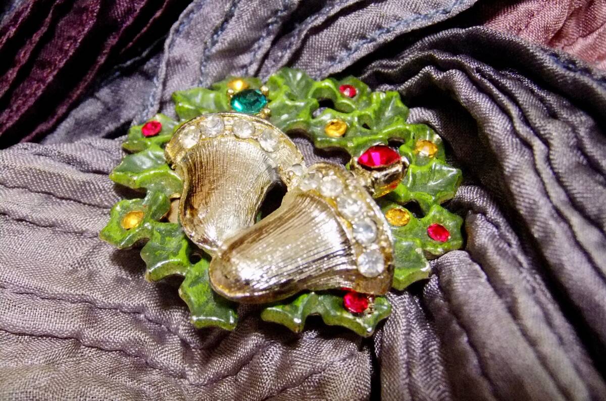 ヴィンテージ品、2つのベル、柊リースのブローチ。