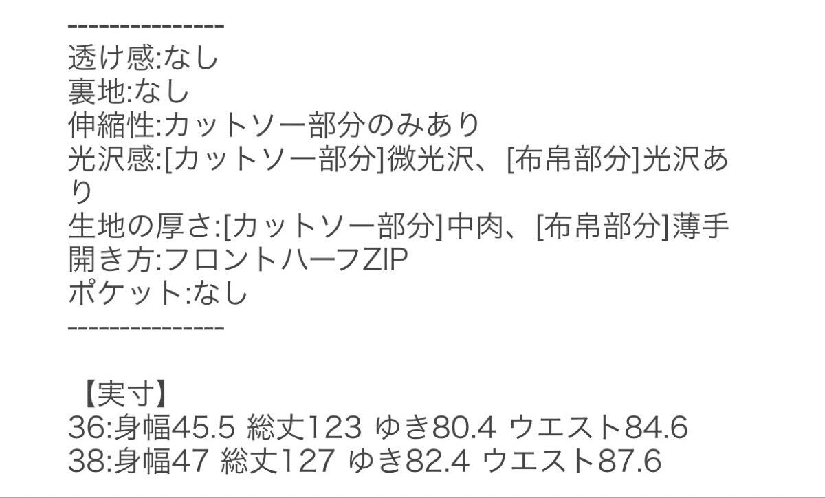 サイズは36で、身幅45.5 総丈123 ゆき80.4 ウエスト84.6です。ゆったりめなシルエットです。