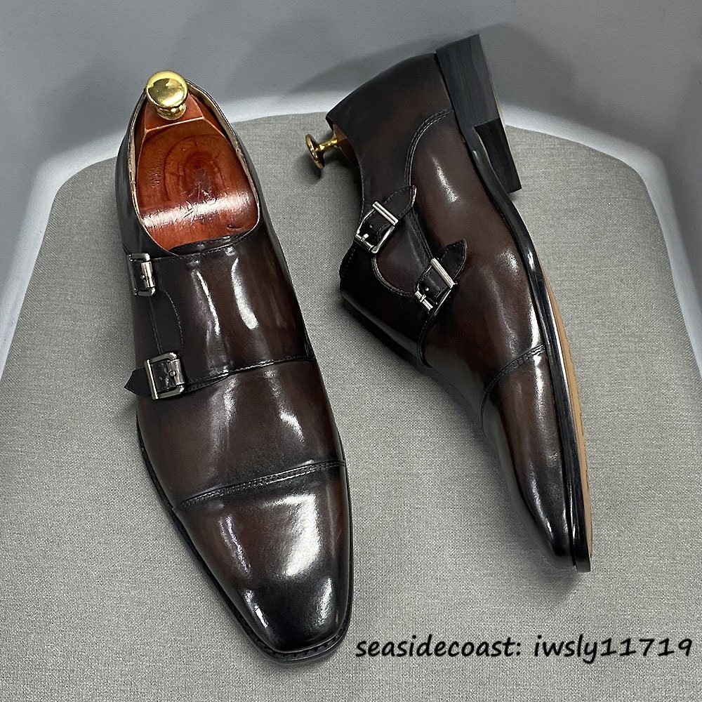 入手困難*ダブルモンクストラップ メンズ 本革 レザーシューズ 職人手作り ビジネスシューズ 最上級牛革 紳士靴 革靴 新品 珈琲色 24.5cm